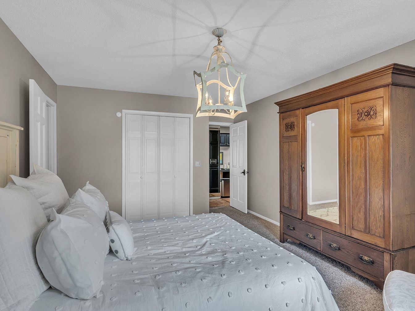 A softly lit bedroom with neutral taupe walls and soft, plush carpeting is anchored by a large bed positioned along the left wall, dressed in crisp white bedding and numerous pillows with textured and dot patterns. Across from the bed, a vintage wooden armoire with ornate carved details and a mirrored panel adds character and historic charm. Closets with double white paneled doors provide storage, and an open door in the background leads to an adjoining room, revealing glimpses of darker cabinetry beyond. An elegant, geometric chandelier casts intricate shadows on the ceiling, contributing to the sophisticated yet cozy atmosphere.