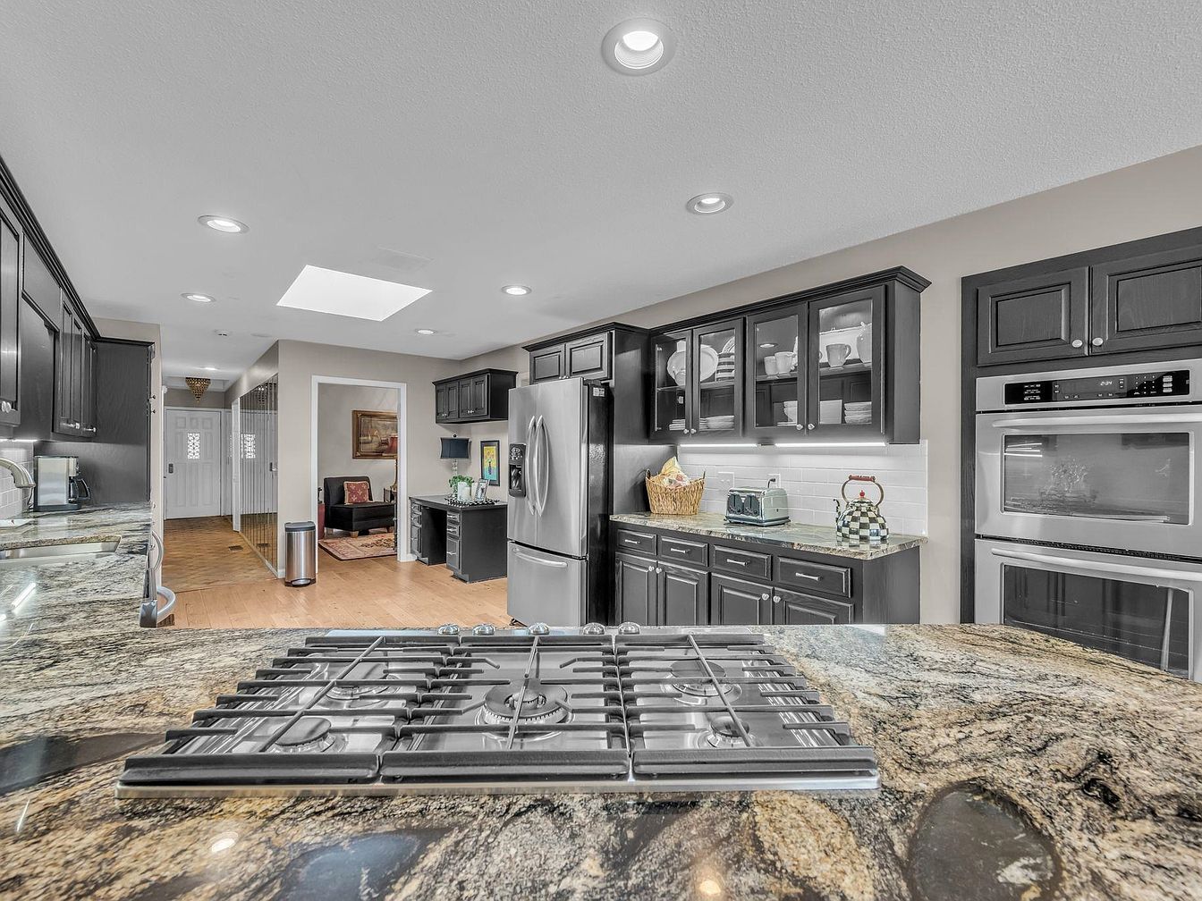 Spacious kitchen with black cabinetry featuring brushed silver hardware and glass-front upper cabinets displaying neatly arranged white dishes. The countertops are a striking, marbled granite in earthy tones of brown, black, and cream. A large central island includes a modern gas cooktop. Stainless steel appliances, including a double wall oven and refrigerator, provide functionality and elegance. Recessed lighting and a skylight keep the kitchen bright and airy, while a white subway tile backsplash adds classic charm. Warm wooden floors extend into an adjoining hallway, where an inviting nook with artwork and a chair can be seen through an open doorway.