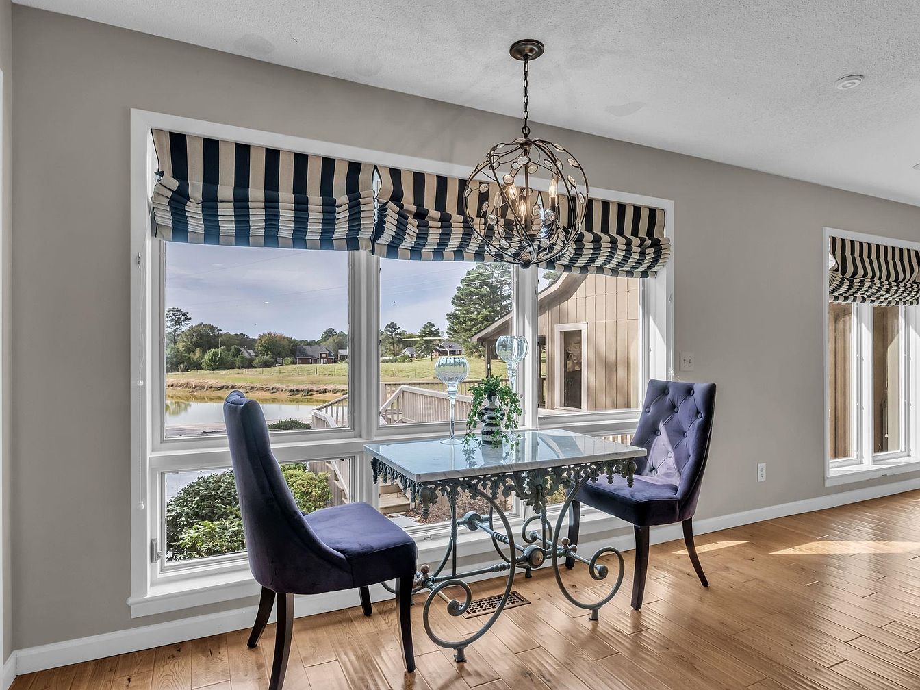 A cozy dining area features a small square glass-top table with an ornate wrought iron base, flanked by two plush, deep blue upholstered chairs with tufted backs. Natural light floods the space through large windows dressed in bold black-and-white striped Roman shades, offering a scenic view of a green lawn, waterway, and distant trees. The walls are painted a soft beige, complementing the warmth of the light wood plank floors. Overhead, a decorative spherical chandelier adds a touch of elegance and soft illumination, creating a welcoming space perfect for intimate meals or morning coffee.