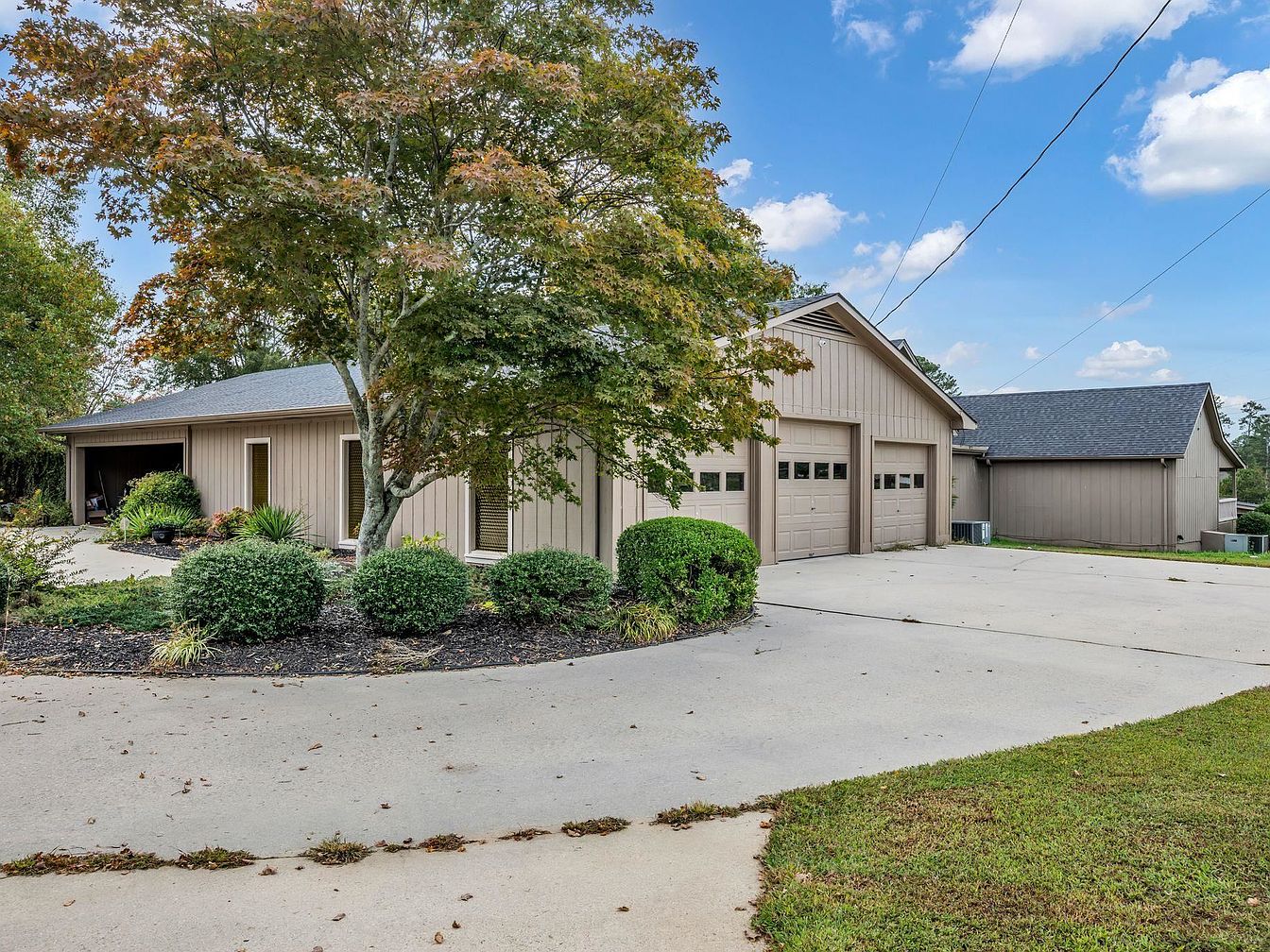 A wide, concrete driveway curves up to a spacious three-car garage, attached to a home with beige vertical wood siding and a dark gray shingled roof. Two large garage doors, along with a smaller garage or storage bay to the left, create a balanced, functional facade. A mature tree with green and orange-tinged leaves stands in a landscaped bed of trimmed shrubs and low bushes in front of the garage, adding curb appeal and shade. The overall look is neat and understated, with a natural color palette that blends into the surrounding greenery and a backdrop of blue sky with scattered clouds.