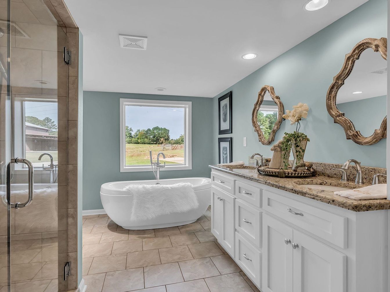 Spacious bathroom featuring a double vanity with white shaker cabinets and granite countertops under two ornately carved wooden-framed mirrors. The walls are painted a soft blue, contributing to a calm, serene atmosphere. A freestanding soaking tub sits beneath a large window, covered by a plush white fur throw for a touch of luxury. Neutral beige tile floors add warmth and complement the overall aesthetic. On the vanity, a decorative tray with flowers and rolled towels enhances the inviting feel. To the left, a glass-enclosed shower with tile walls provides a modern, clean detail to the classic space.