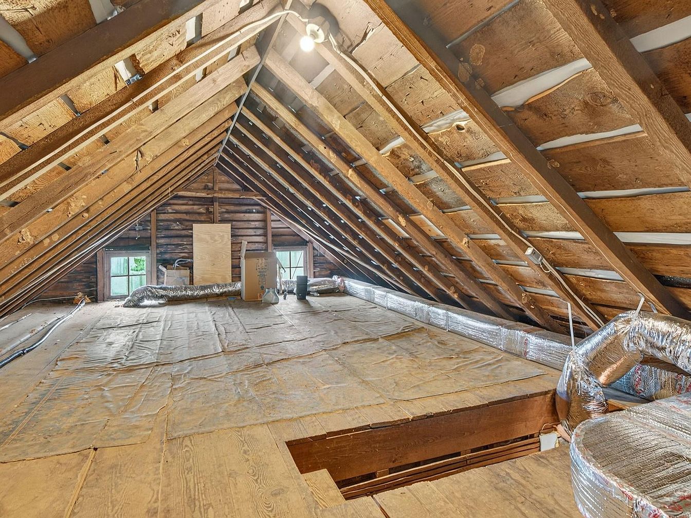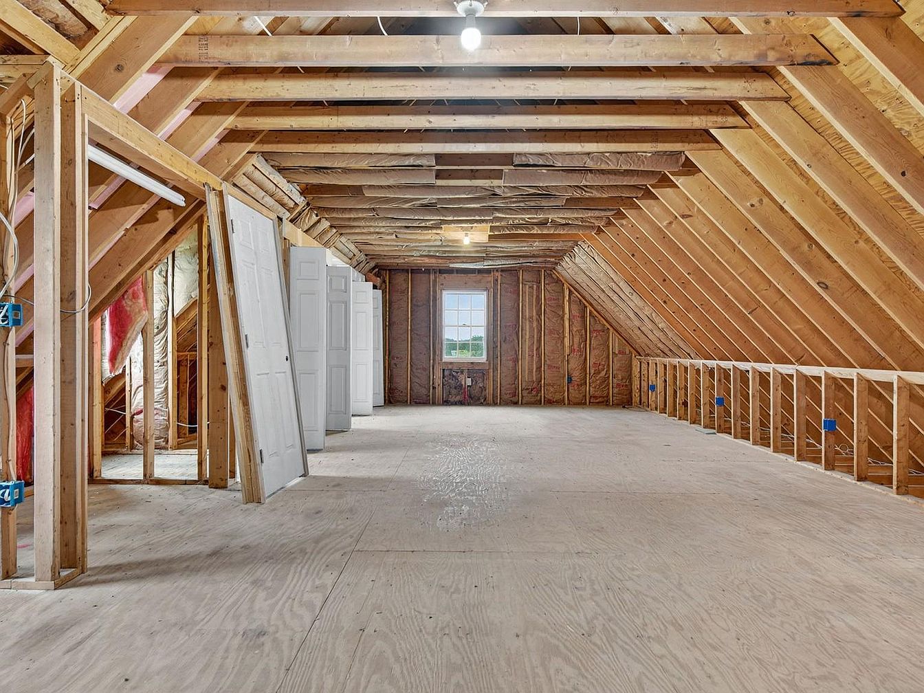 A spacious attic featuring a vaulted ceiling with exposed wooden beams, showcasing the rustic charm of the home. The floor is bare plywood, offering potential for various uses such as a playroom or storage area. On the left, several white doors lean against the framing, indicating future rooms or storage options. Insulation peeks through gaps in the walls, adding a quaint, unfinished character. A window at the far end allows natural light to fill the space, enhancing the airy feel. The overall aesthetic leans towards a blend of industrial and rustic, perfect for creative renovation.