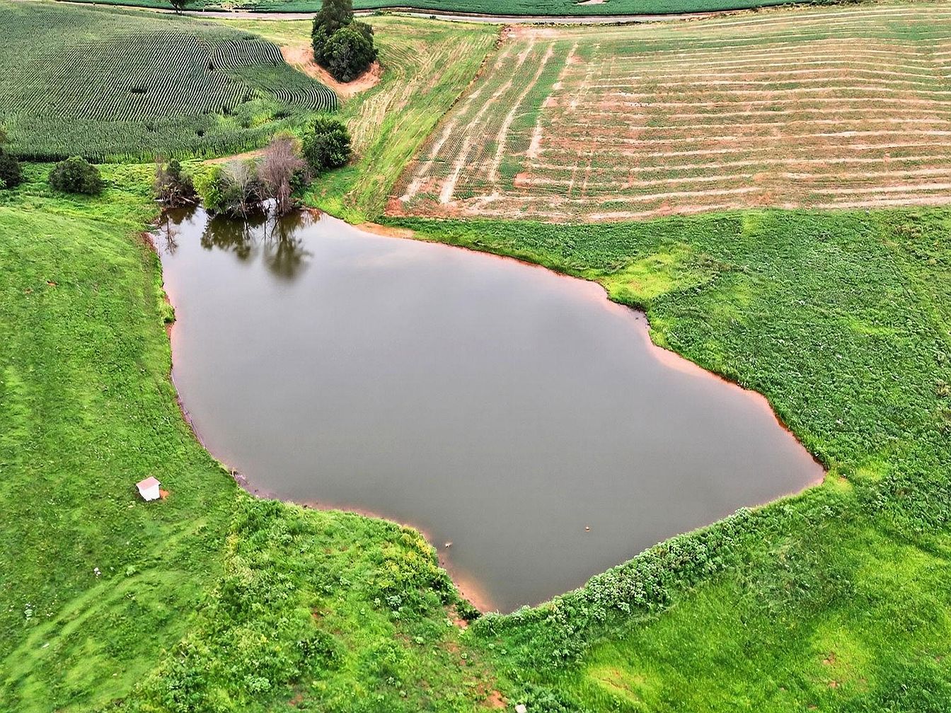 A tranquil pond is nestled within lush greenery, surrounded by vibrant fields and thick foliage. The water reflects the sky, creating a mirror-like surface that captures the serene landscape. Tall grasses and clusters of trees provide a natural border around the pond’s edge. In the background, cultivated farmland extends, showcasing rows of crops in various shades of green and brown. The overall aesthetic exudes a peaceful and rural charm, emphasizing nature’s beauty and harmony. A simple wooden structure is faintly visible near the pond, adding a touch of rustic character to the scene.