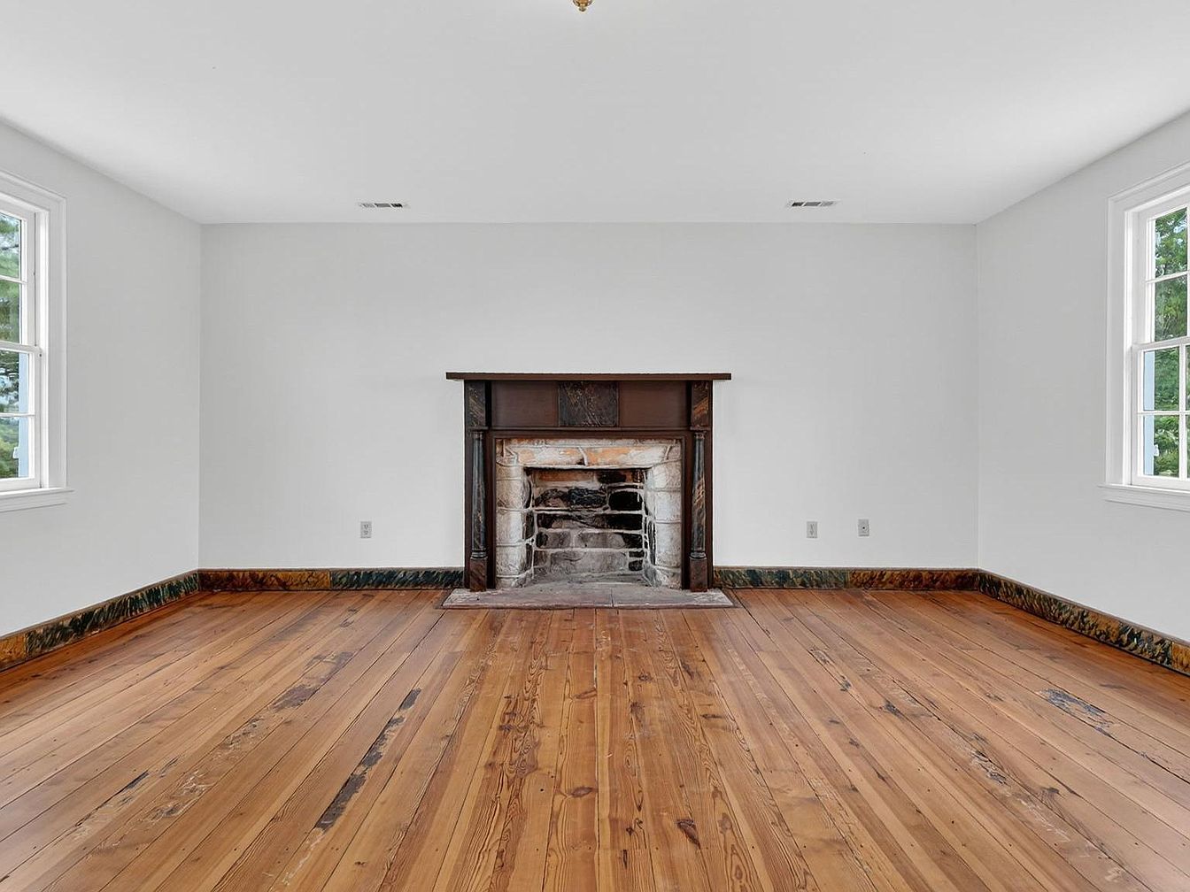A spacious living room featuring warm, polished wooden flooring that adds a rustic charm. The walls are painted in a soft white, creating a bright and airy atmosphere. A traditional stone fireplace stands as the focal point, framed by a dark wooden mantle, highlighting its historical significance. Large windows on either side allow natural light to flood in, enhancing the room’s openness. The low marble skirting at the base of the walls introduces a hint of elegance. Overall, the space balances old-world character with modern cleanliness, inviting comfort and relaxation.