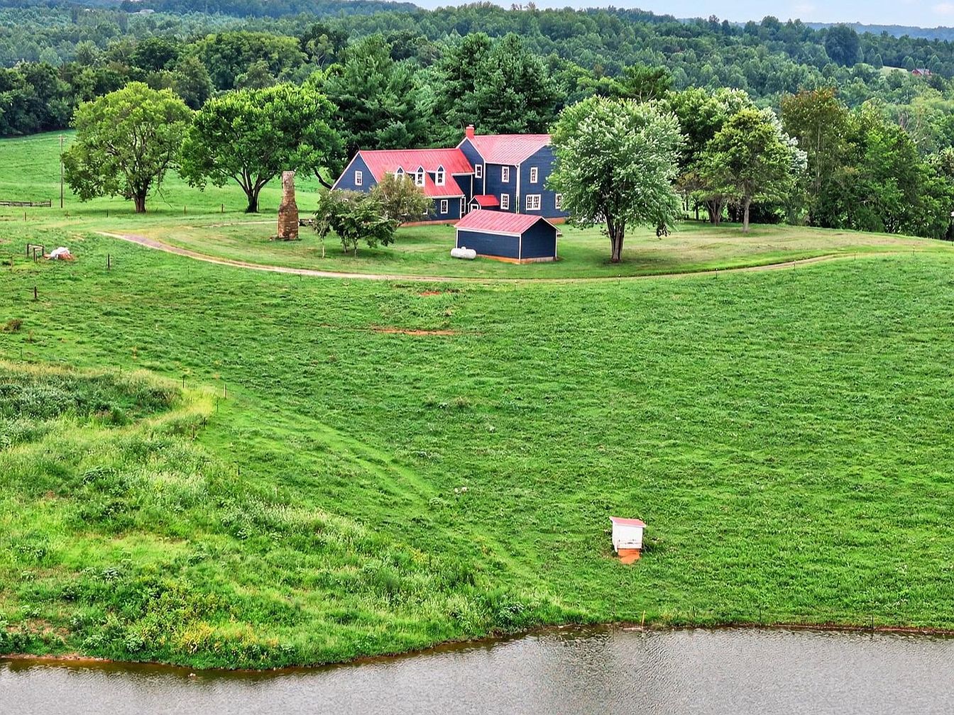 A spacious historic American home nestled amidst lush greenery, showcasing a classic architectural style. The house features a dark blue siding complemented by white window trim and a vibrant red roof. The rounded driveway leads to the home, flanked by a mix of mature trees and open grassy areas, creating a peaceful ambiance. A rustic stone chimney adds character, suggesting warmth and tradition. To the side, a red barn enhances the countryside feel. Surrounding fields are dotted with wild grass, while a serene body of water reflects parts of the landscaping, embodying tranquility and natural beauty.