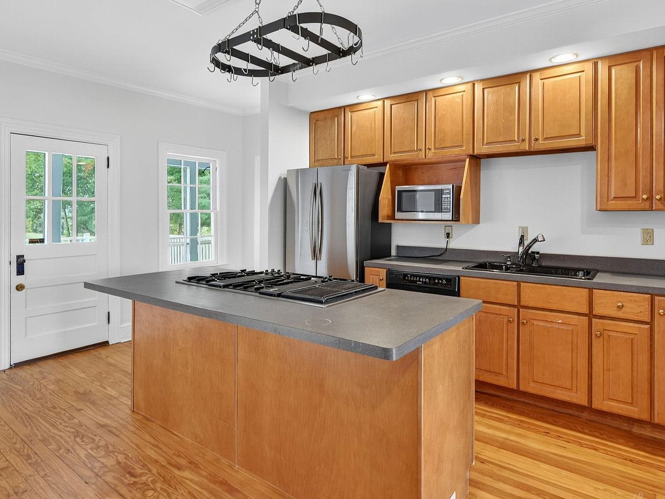 This contemporary kitchen features warm wooden cabinetry, illuminated by recessed lighting that highlights the sleek countertop. A central island with a built-in gas cooktop acts as a functional focal point, complemented by a simple yet elegant range hood above. The space showcases stainless steel appliances, including a large refrigerator and a microwave, seamlessly integrated into the cabinetry. Light-colored walls create a bright atmosphere, while the natural wood flooring adds warmth. A door with multiple panes invites natural light and connects to the outside, enhancing the open, welcoming vibe of the area.