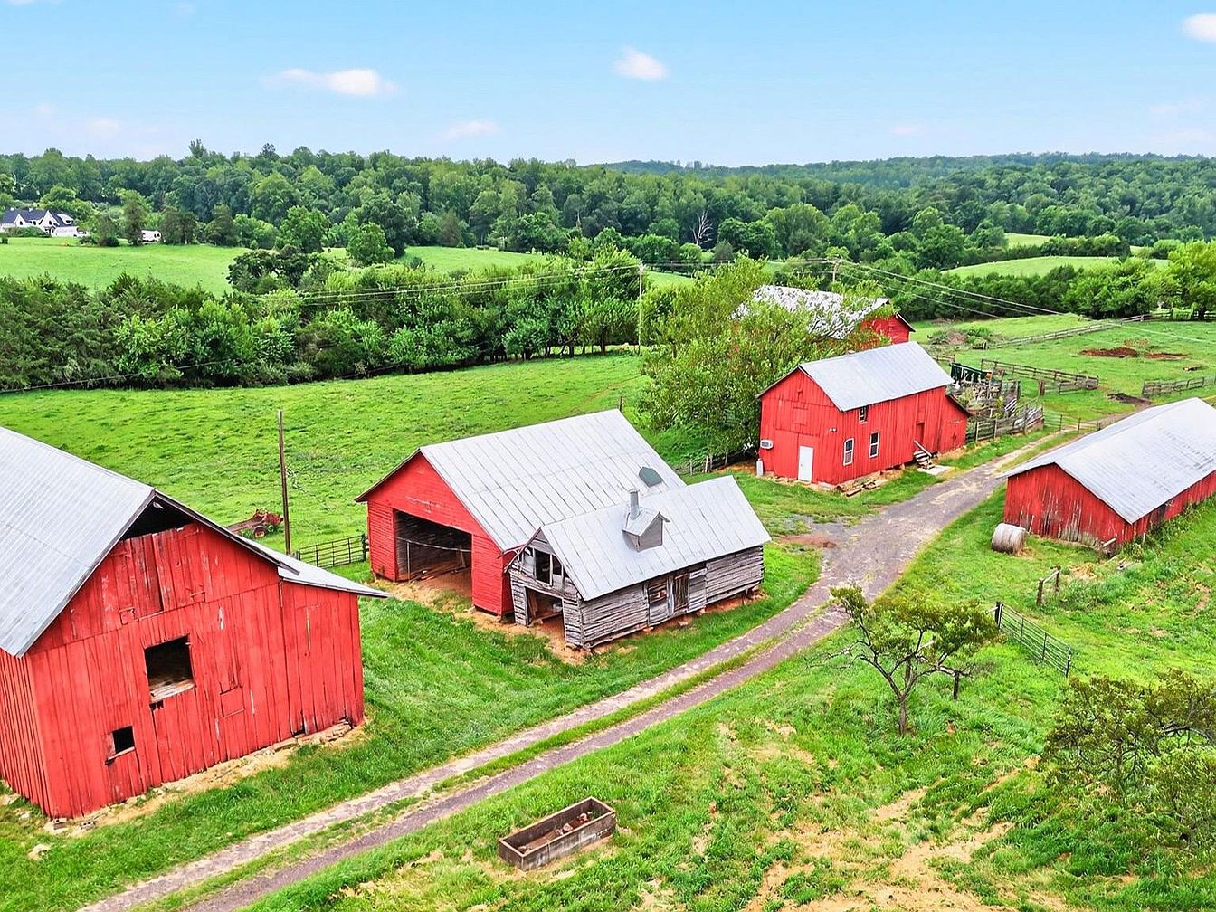 Aerial view of a rustic barn complex, showcasing several red wooden barns with metal roofs, indicative of classic American farm architecture. The vibrant red color contrasts vividly against the lush green grass and trees surrounding the area. A winding gravel path connects the structures, adding an element of charm to the landscape. Each barn varies slightly in design, with some featuring open fronts and others closed off, hinting at diverse agricultural uses. In the background, expansive fields and rolling hills extend, highlighting the tranquil rural setting, often characterized by hardworking, picturesque farm life.