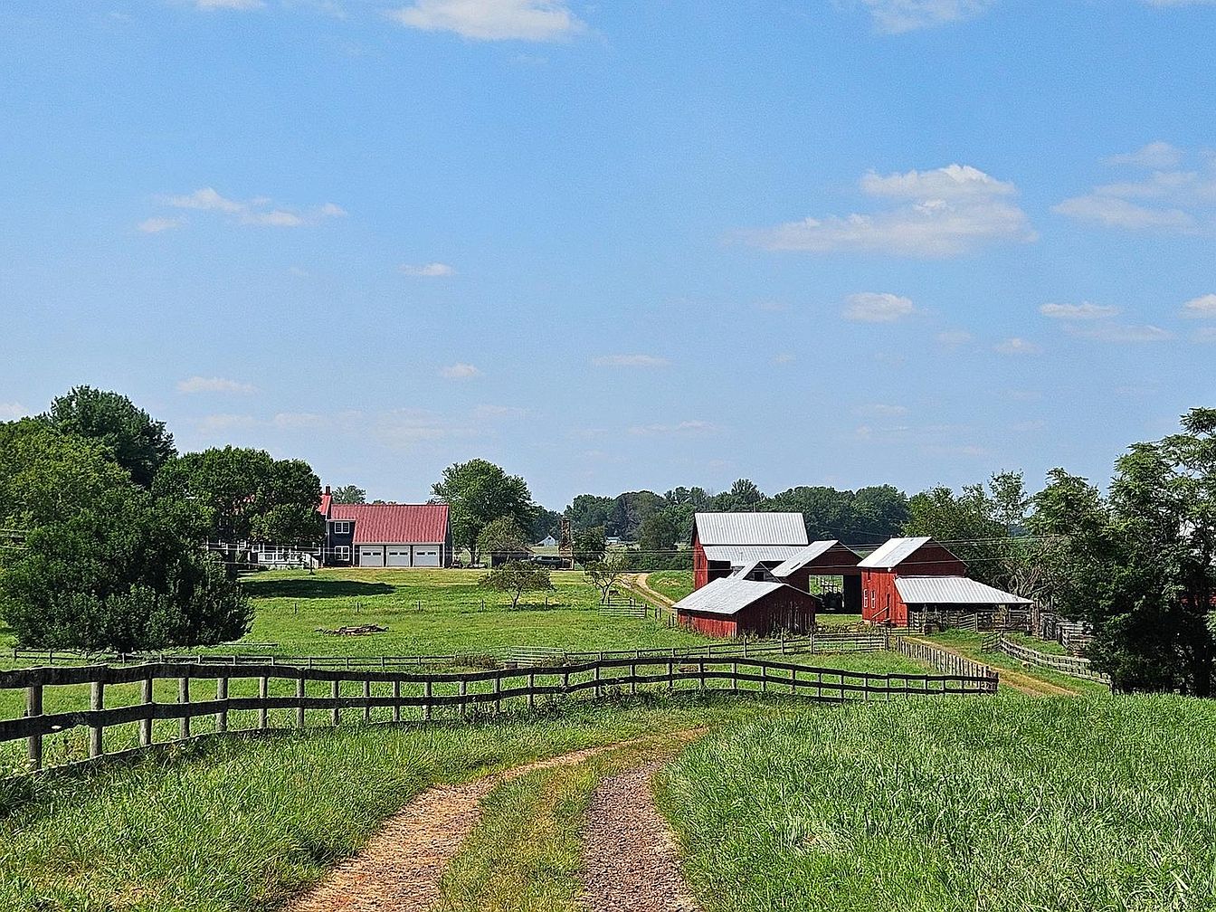 A serene farm landscape unfolds, showcasing a winding gravel path leading through lush green grass. On the left, a charming two-story house features a striking red roof, surrounded by well-manicured shrubbery and trees. To the right, traditional red barns with silver roofs stand in contrast against the vibrant greenery. The rustic wooden fence runs parallel to the path, adding a quaint touch to the scenery. A clear blue sky dotted with fluffy clouds enhances the tranquil atmosphere. This setting combines natural beauty with classic American rural architecture, evoking a sense of peace and homeliness.