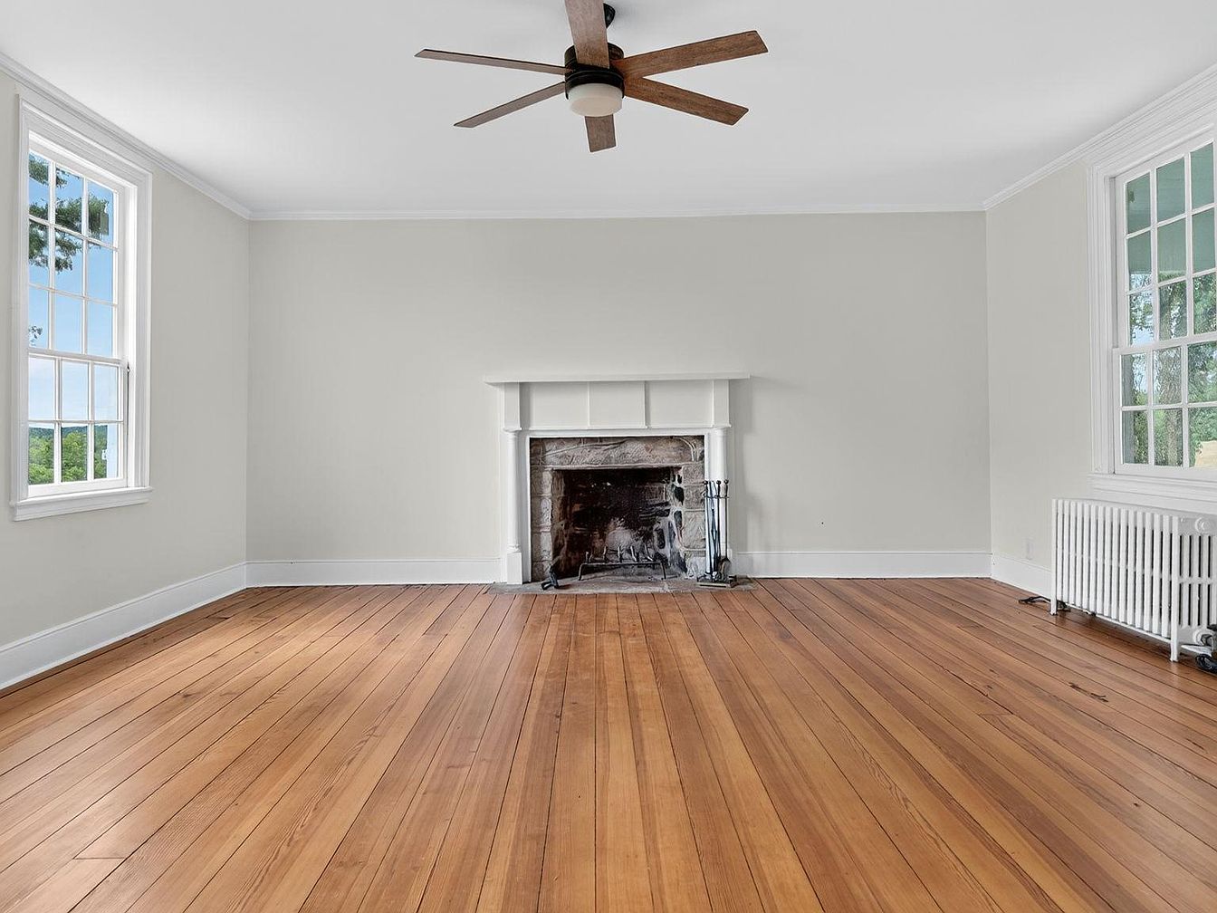 A spacious living room features classic elements with two large windows allowing ample natural light, enhancing the airy atmosphere. The walls are painted in a soft beige, complementing the rich, warm tones of the wide-plank hardwood flooring. Central to the room is a vintage fireplace with a simple white mantel, suggesting a cozy focal point. A modern ceiling fan with wooden blades adds a contemporary touch. The simple design and muted color palette create a calm, inviting space, perfect for relaxation or entertaining. The open layout encourages a seamless flow into potential adjoining areas.