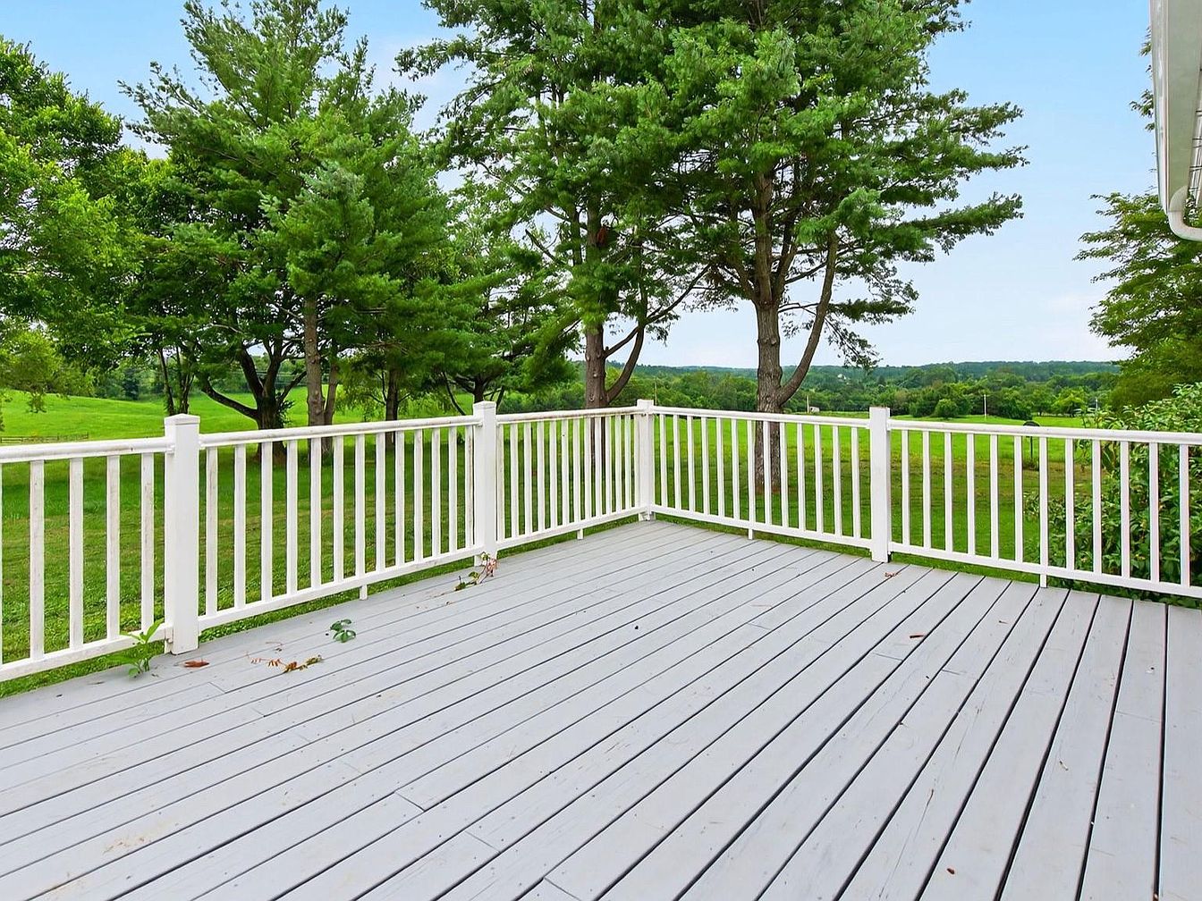 A spacious wooden deck features a light gray stained floor, enhancing a fresh, airy atmosphere. The white railings provide a classic touch, creating visual contrast against the soft gray flooring. Lush green trees frame the view, casting gentle shadows and adding depth to the space. The expansive scenery beyond showcases a rolling landscape adorned with greenery, inviting outdoor leisure. Occasional plants peek from the floor, suggesting potential for greenery or decor. The open layout encourages social gatherings and relaxation, with ample space for outdoor furniture, perfect for enjoying serene moments amidst nature.