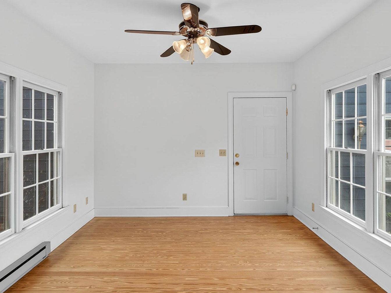 A bright sunroom with a spacious layout featuring large windows that allow ample natural light. The walls are painted white, enhancing the airy feel of the space. The hardwood floor, with its warm tones, complements the simplicity of the room. A ceiling fan with light fixtures hangs centrally, providing comfort and style. The door on the right leads outside, accentuating accessibility. Baseboard heating ensures warmth during colder months. The room’s minimalist design invites personalization, making it an ideal spot for relaxation or indoor gardening. Overall, the aesthetic is serene and inviting, promoting a connection with nature.