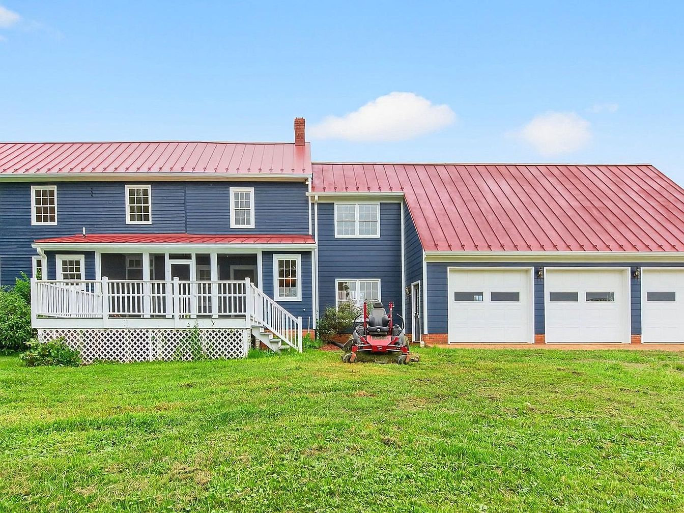 The image shows the exterior of a historic American home with a spacious layout featuring a vibrant blue facade. A striking red metal roof contrasts beautifully with the home’s walls, enhancing its rustic charm. The porch, adorned with white railings, invites relaxation and outdoor gatherings. Several large windows allow for ample natural light, framed by white trim. Adjacent to the house, a well-maintained lawn gives a spacious feel, while a lawnmower positioned on the grass indicates practicality. The garage attached on the right, with its clean lines and modern style, complements the home’s vintage aesthetic.