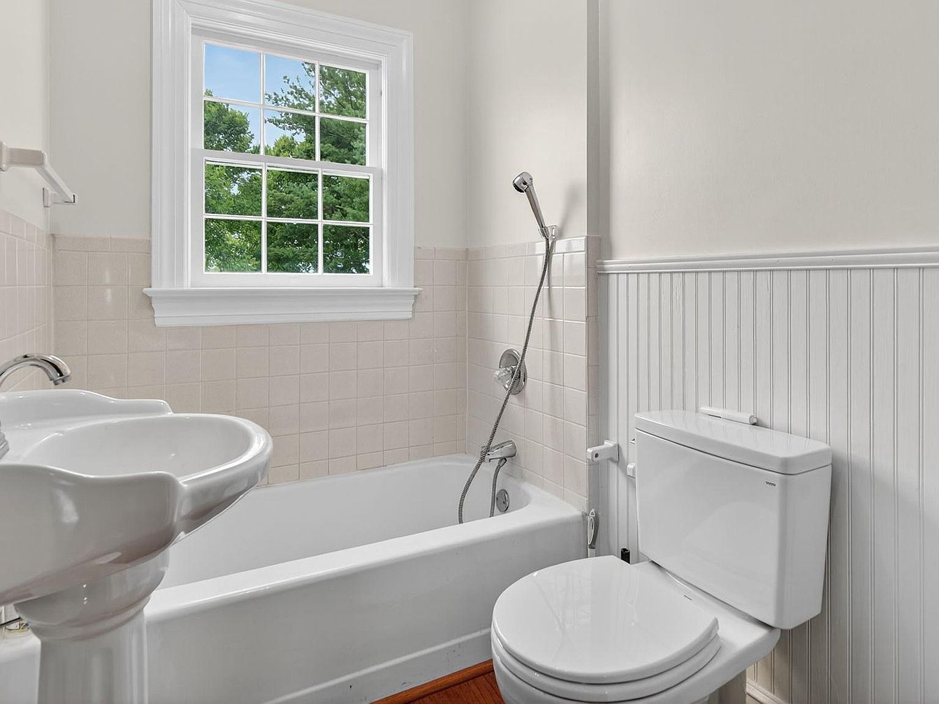 A compact bathroom featuring a classic design with a blend of vintage and modern elements. The color scheme consists of soft beige tiles set half-wall in a glossy finish, contrasting with the glossy white trim and window framing. A white porcelain sink stands prominently near the shower-tub combo, its curved shape offering a traditional feel. The simple, sleek toilet complements the overall aesthetic. Natural light floods in through a large window adorned with a multi-pane design, drawing attention to the greenery outside. The warm wooden floor adds warmth, balancing the sleekness of the fixtures.