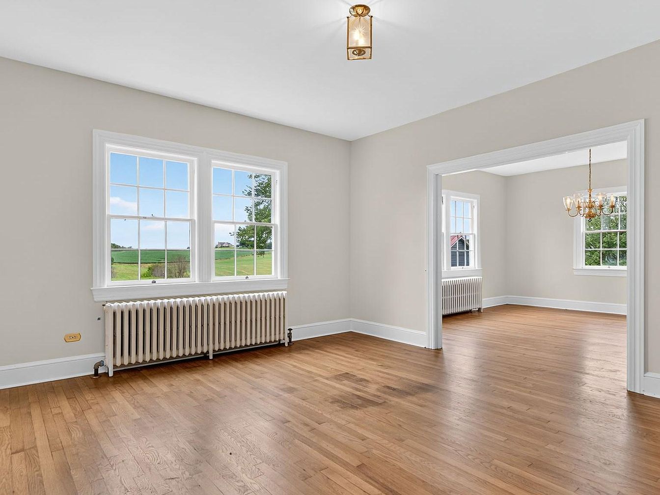 This living room features a spacious layout with polished wooden floors and soft beige walls, creating a warm and inviting atmosphere. Large, dual-pane windows flood the space with natural light, showcasing picturesque views of the green landscape outside. A classic white radiator sits beneath the windows for added comfort. An archway leads to an adjacent room, which also has ample natural light and a chandelier that adds elegance. The room’s design strikes a balance between historic charm and modern simplicity, emphasizing clean lines and architectural detailing through the white trim around windows and doorways.