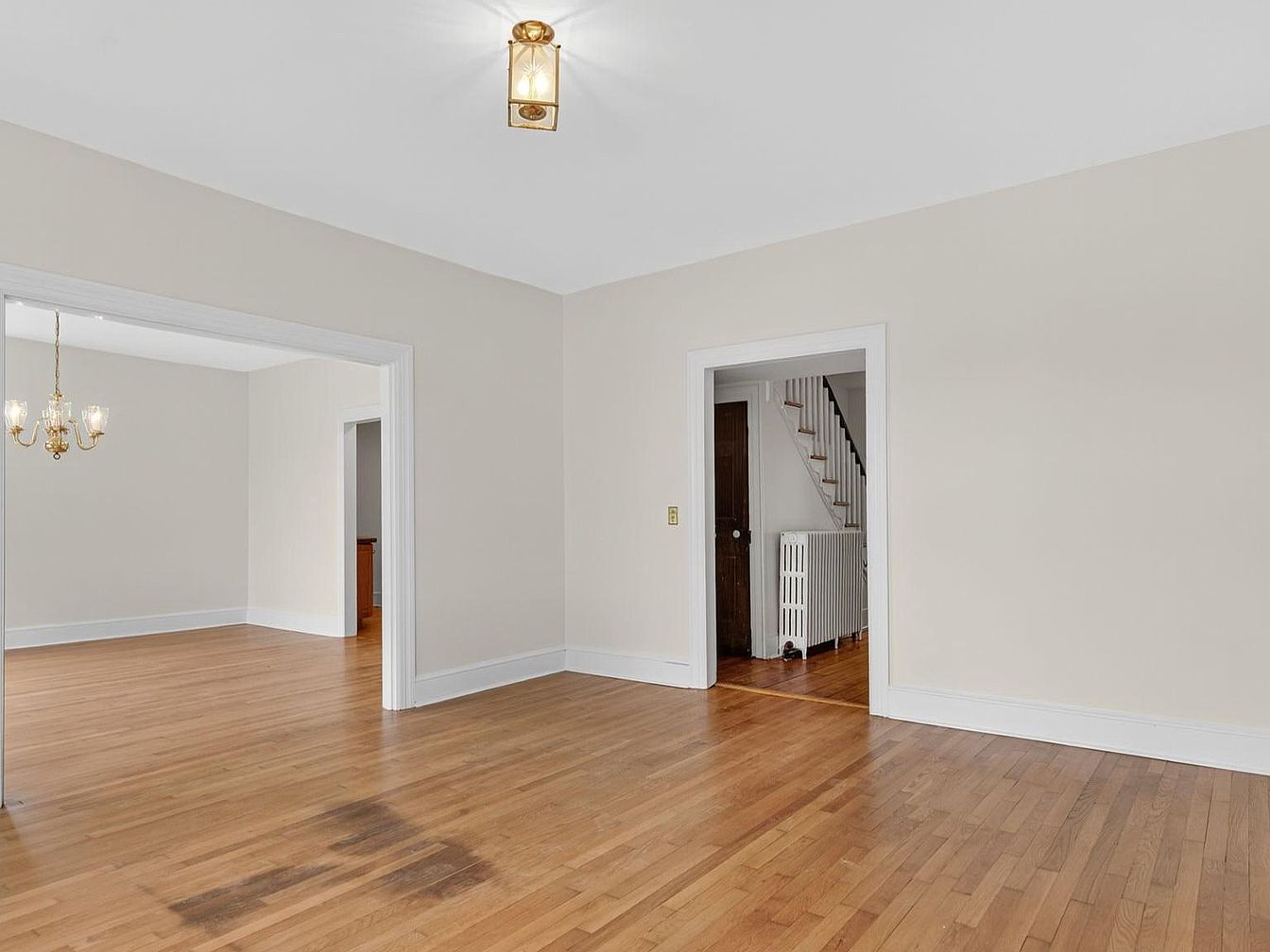 A spacious living room features light beige walls, enhancing the airy atmosphere. The hardwood flooring presents a warm tone, complementing the subtle elegance of the space. A simple yet decorative light fixture hangs from the ceiling, providing soft illumination. An open doorway leads into a dining area with a charming chandelier, hinting at a welcoming flow between rooms. The architectural details include crown molding and baseboards that enhance the classic feel. To the side, a door reveals a staircase, while a white radiator adds a vintage touch, combining functionality with period charm throughout the design.