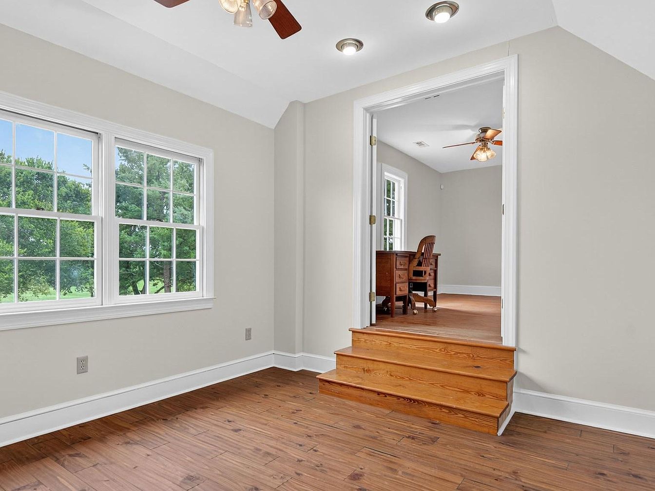 A serene study room adorned with a soft, neutral color palette of light beige walls. The space features large double-hung windows, providing ample natural light and a view of lush greenery outside. Classic wooden flooring adds warmth, complemented by white baseboards. A modest staircase leads to the adjoining space, highlighting the room’s elevation. A traditional wooden desk is visible through an open doorway, inviting productivity and focus. The ceiling fan with decorative light fixtures adds a touch of elegance while ensuring comfort. Overall, the room conveys a calm, inviting atmosphere, suitable for work or study.