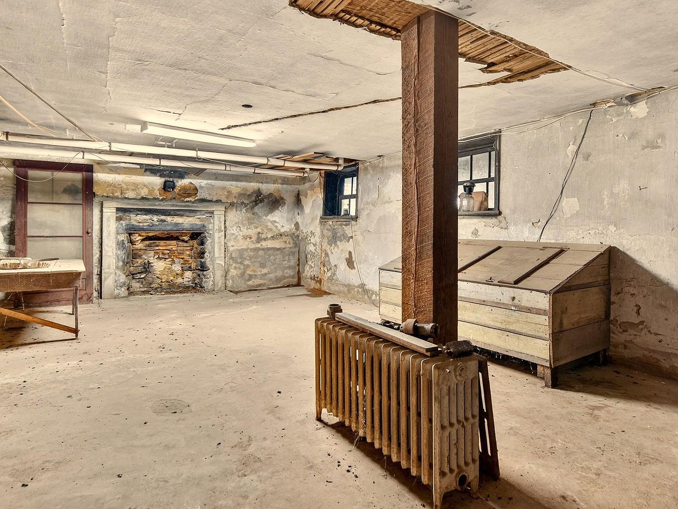 The basement features a raw, utilitarian aesthetic with exposed concrete walls and a ceiling displaying structural beams. The floor is bare and unpolished, emphasizing the space’s utilitarian purpose. A stone fireplace, partially hidden behind peeling paint, adds a touch of rustic charm, contrasting the starkness of the surroundings. Wooden storage boxes are scattered throughout, hinting at past use. A vintage radiator, slightly rusty, is placed prominently in front of the fireplace, providing a central focal point. Small windows allow for minimal natural light, enhancing the dim, historical atmosphere of this underutilized space.