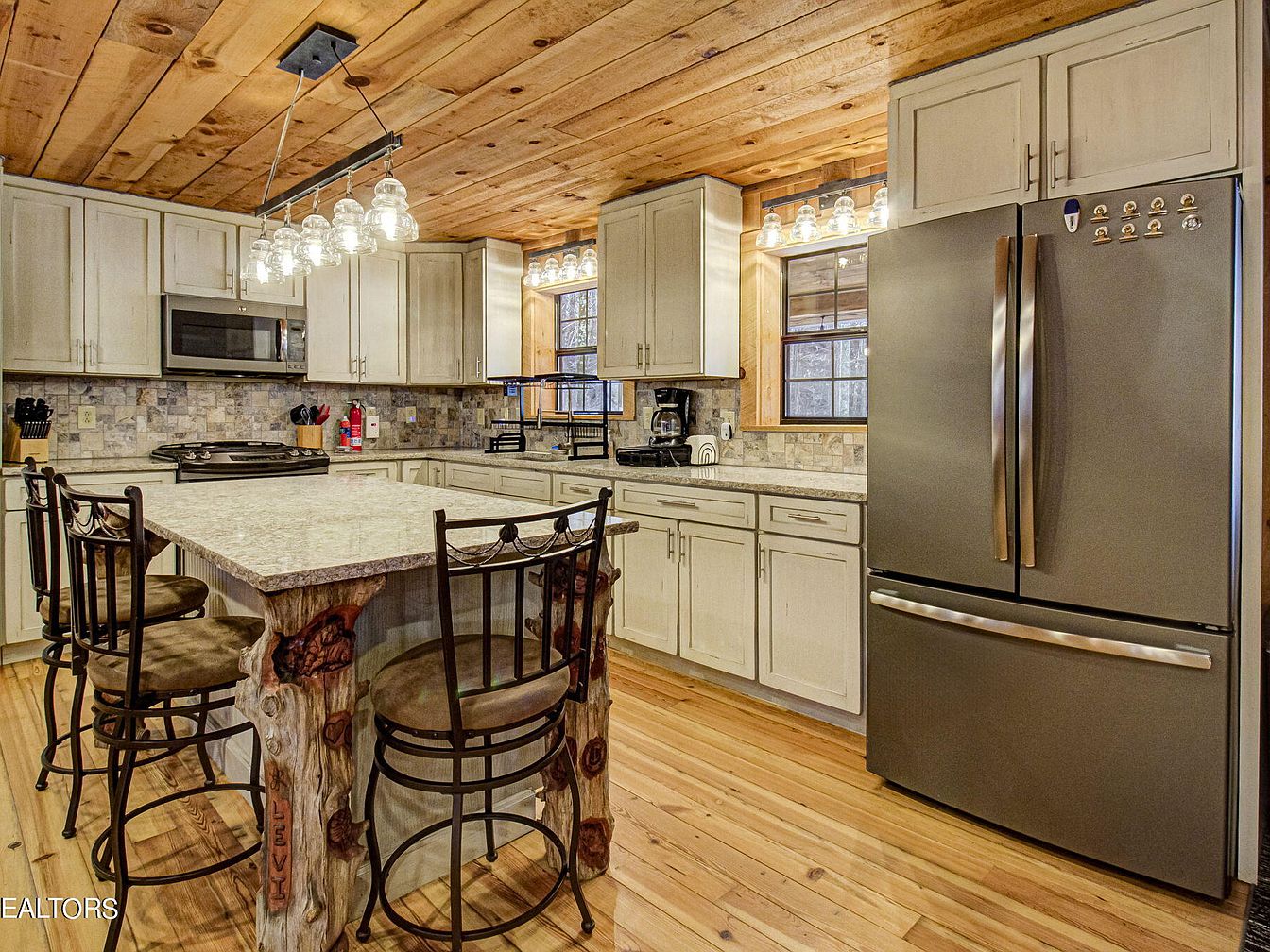 This kitchen features a harmonious blend of rustic and modern design elements. A warm wood ceiling with exposed beams complements the light-colored cabinetry. Countertops are adorned with a polished granite surface, contrasting nicely with the rustic, log-style bar stools that invite casual gatherings. Stainless steel appliances enhance a contemporary feel, including a sleek refrigerator prominently displayed. Natural light pours in from strategically placed windows, highlighting the textured stone backsplash. The open layout encourages interaction, making the kitchen both functional and inviting. Overall, the aesthetics embrace a cozy, lodge-like ambiance while maintaining modern conveniences.