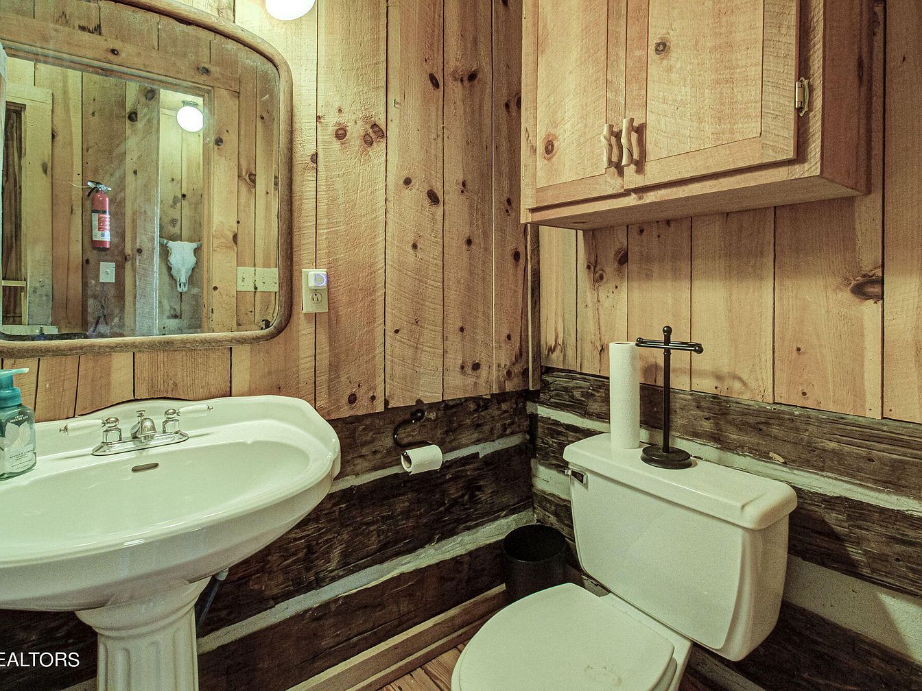 This rustic bathroom features wooden walls with exposed log elements that create a cozy, cabin-like atmosphere. The color palette consists of warm browns from the wood, complemented by the white porcelain sink and toilet. A vintage-style sink is positioned near a large oval mirror framing a soft light fixture overhead. Above the sink, a wooden cabinet offers functional storage, while a black metal toilet paper holder provides a contemporary contrast. The overall layout is compact yet functional, creating an inviting space that blends modern amenities with natural, rustic charm.