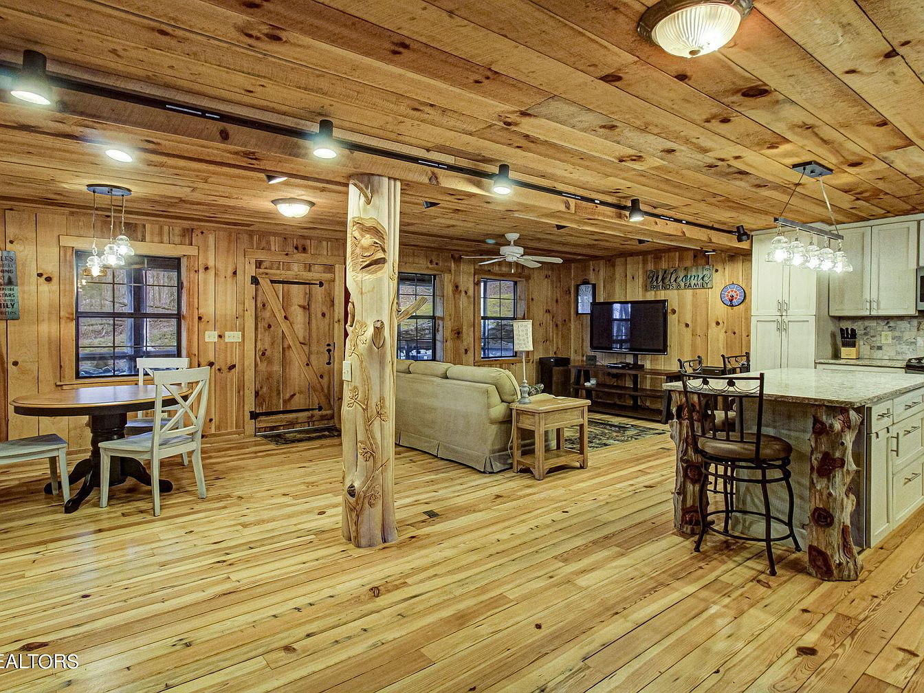 Open layout featuring a cozy living area with natural wood elements. The ceiling showcases wooden beams and planks, complemented by warm lighting from modern fixtures. A partially visible kitchen area with an island accented by uniquely carved wood invites interaction. The flooring is light-toned, enhancing the rustic charm. A round dining table, paired with light blue chairs, creates a relaxed dining nook. The walls are lined with wood paneling, enhancing warmth and comfort. Windows allow natural light to filter through, framing outdoor views, while a mounted television adds a contemporary flair to the timeless design.