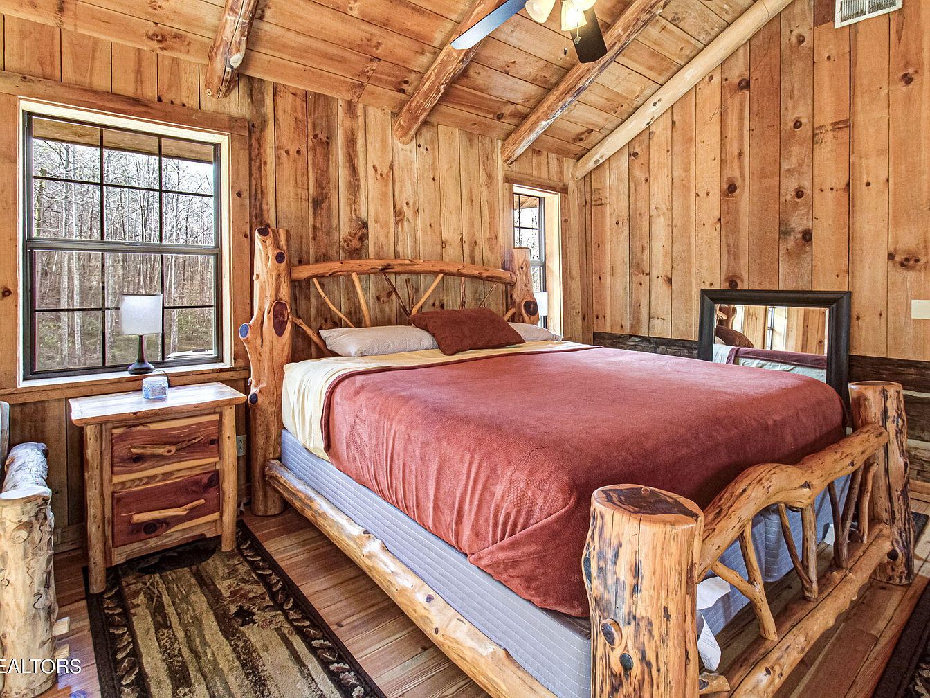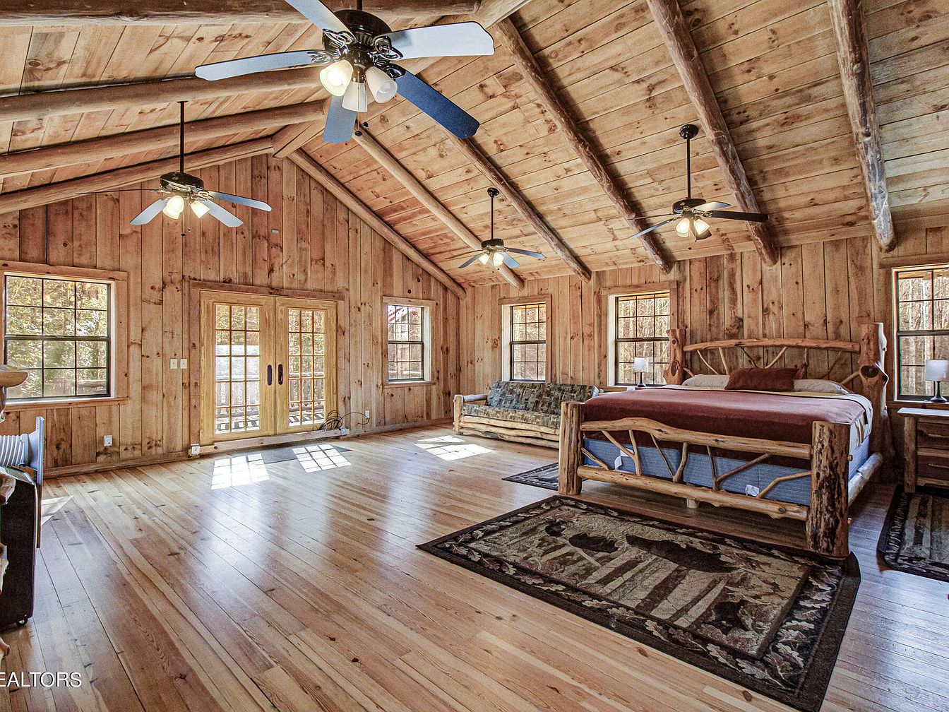 This spacious bedroom features a rustic design with natural wood paneling and vaulted ceilings, creating a warm, inviting atmosphere. The wooden beams add character, while the hardwood floor enhances the room’s charm. A king-size bed with a deep burgundy comforter serves as the centerpiece, accompanied by elegant log-style side tables. A cozy bench runs against one wall, offering additional seating. Large windows allow ample natural light, framed in wood, providing views of the surrounding landscape. Two ceiling fans help maintain comfort, and a dresser is strategically placed for storage, adding functionality to the aesthetic appeal.