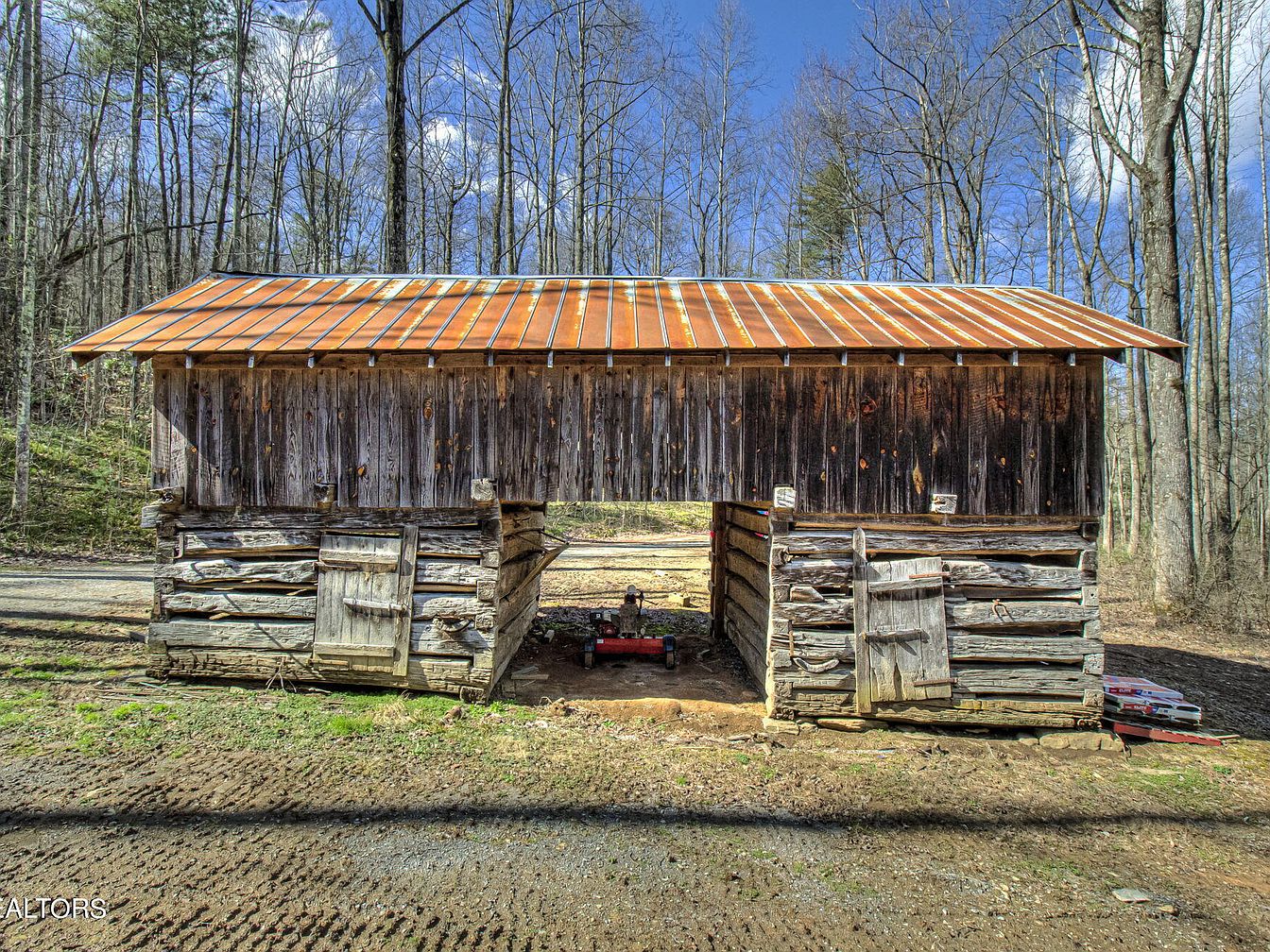 The barn showcases a rustic, well-crafted wooden exterior with a distinctive peaked roof. Its façade features horizontal planks in a natural wood finish, blending harmoniously with the surrounding trees. Large sliding doors, crafted from the same timber, provide accessible entry. The structure is partially shaded by a porch supported by sturdy wooden beams, enhancing the barn’s charm. A collection of firewood is stacked nearby, emphasizing the practical use of the space. The gravel driveway leads to various tools and equipment scattered within, revealing the barn’s multifaceted functionality as both storage and workspace in a serene, wooded setting.