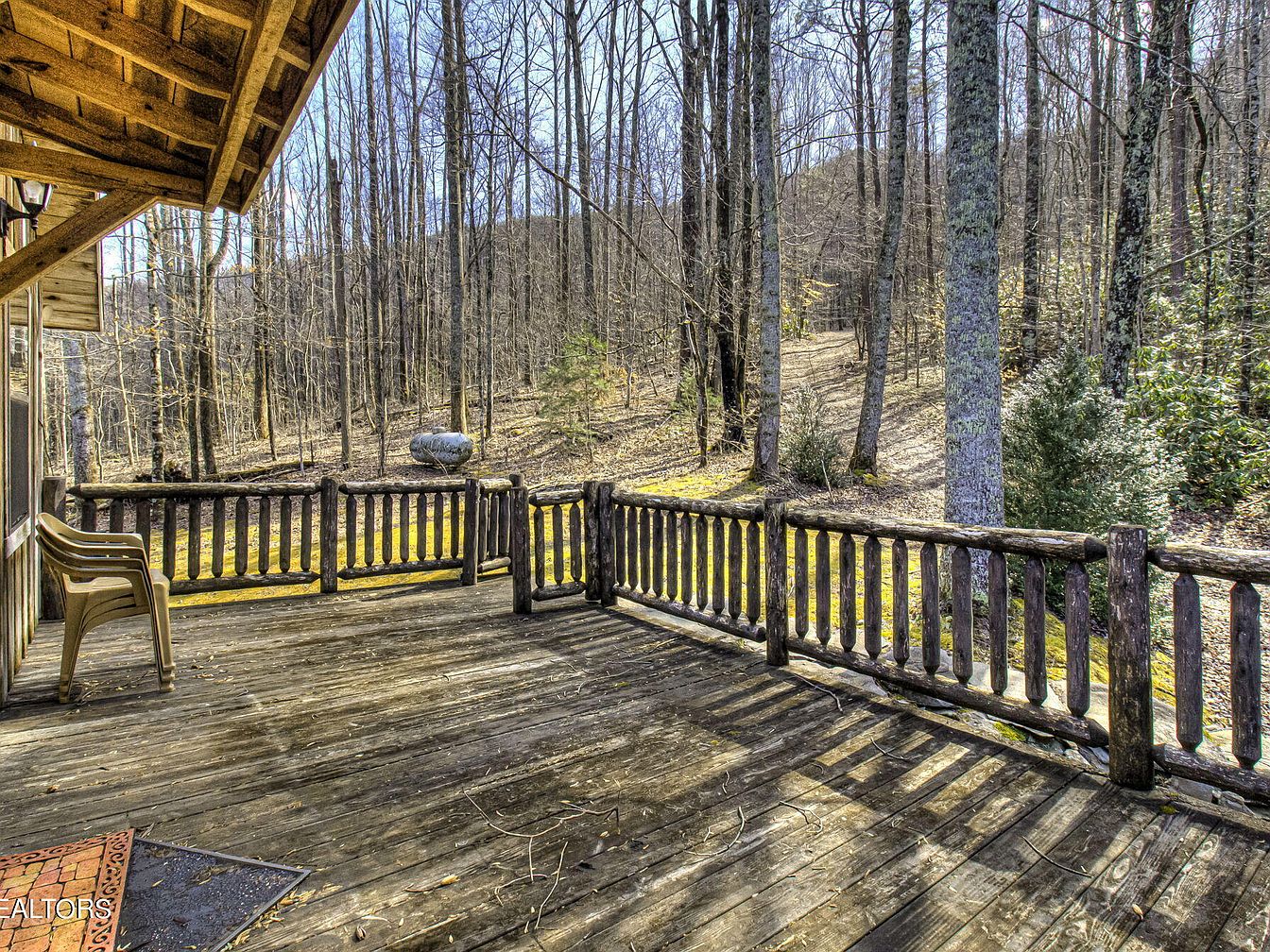 An expansive outdoor deck extends from the house, featuring rustic wooden railings that harmonize with the natural surroundings. The deck’s weathered wood adds character, complementing the serene backdrop of trees, subtly hinting at seasonal foliage. A plastic chair sits invitingly in a corner, enhancing the casual atmosphere. Sunlight streams through the trees, casting playful shadows that dance across the deck’s floor. The setting is tranquil, perfect for gatherings or solitude. Nearby, a boulder rests on the sloping ground, integrating seamlessly into the landscape. This outdoor space embodies a connection to nature, ideal for relaxation.