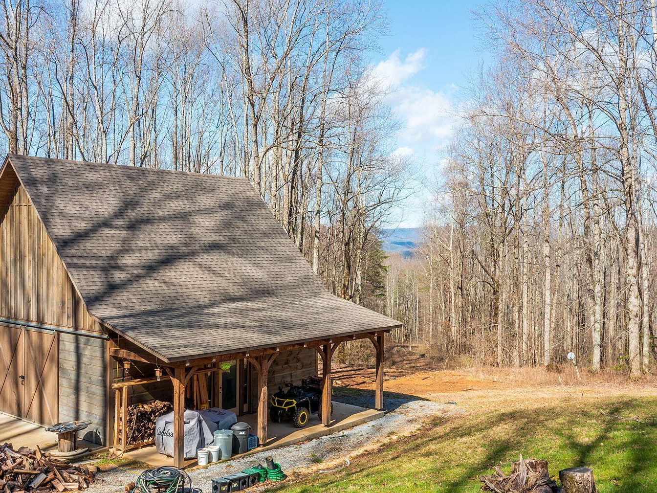 A spacious detached garage features a classic gable roof with dark shingles and wooden siding. The structure is set amidst a serene forest backdrop with tall, slender trees and distant rolling hills. The porch area is supported by sturdy wooden beams that add a rustic charm, providing a welcoming entry point. To the side, neatly stacked firewood and various outdoor equipment suggest practicality and functionality. The ground is gravelly, contributing to a natural, outdoor aesthetic. Sunlight filters through the trees, casting gentle shadows and creating a tranquil atmosphere perfect for outdoor storage or recreational activities.