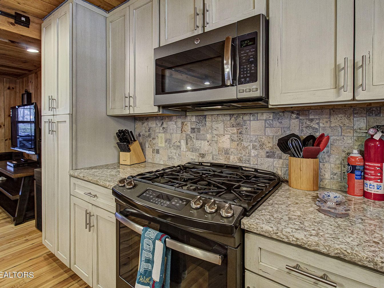 This cozy kitchen features natural wood paneling and modern elements. The cabinetry is a soft white with sleek handles, enhancing the space’s brightness. A granite countertop in a neutral tone complements the textured stone backsplash, adding warmth and depth. The stainless steel stove and microwave provide a contemporary contrast against the rustic backdrop. Careful organization displays cooking utensils in a bamboo holder, while a fire extinguisher and small decorative items suggest both practicality and attention to detail. The warm wooden floor adds a inviting touch, bridging traditional and modern aesthetics in this functional cooking space.