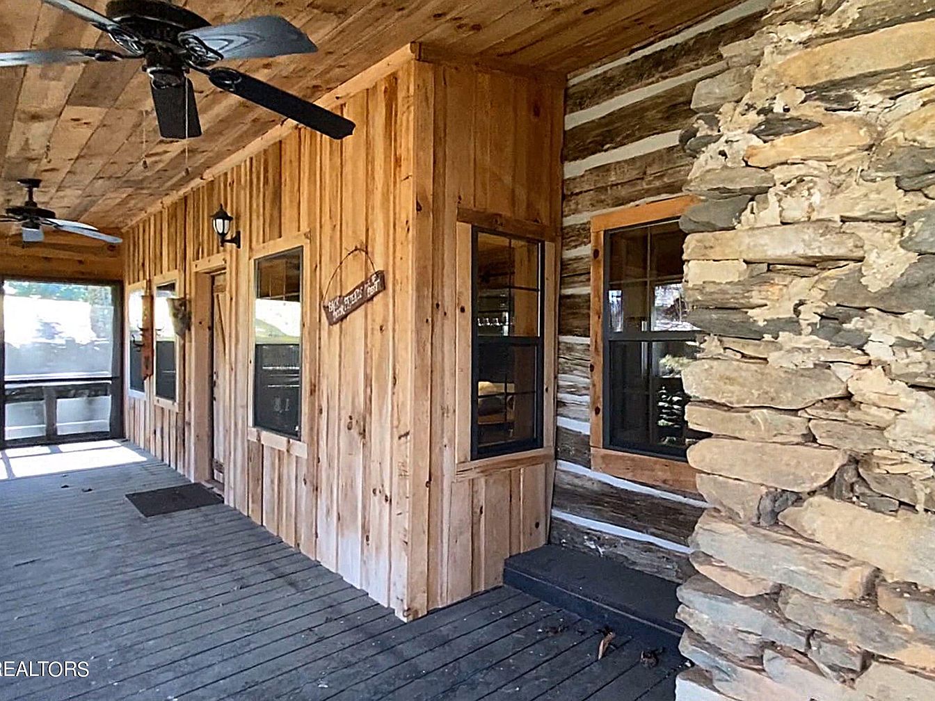 This space showcases a charming porch area featuring rustic wooden paneling and log cabin elements. The wooden ceiling adds warmth, accentuated by two ceiling fans for ventilation. Natural light floods through multiple windows, which are framed in a deep, rich brown, complementing the weathered stone wall on the right. The combination of materials—wood and stone—creates a harmonious contrast, enhancing the outdoor feel. An inviting mat at the entrance hints at hospitality, while a small sign hangs on the wall, contributing to the homey vibe. The overall aesthetic embodies a blend of historic charm and comfortable living.