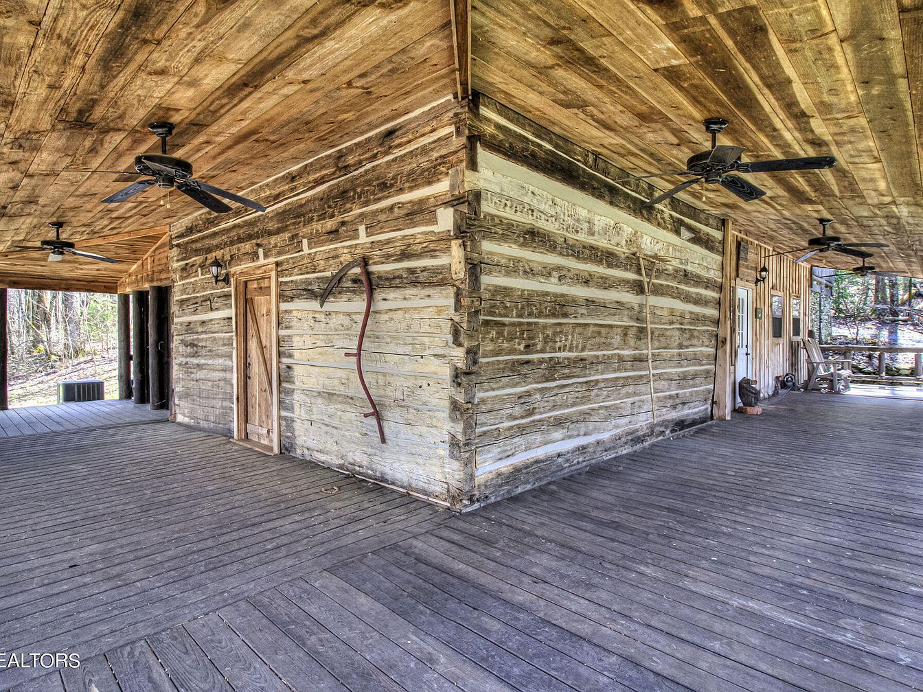 This image highlights a rustic porch area featuring a blend of natural wooden textures and tones. The ceiling showcases a warm wood finish, complementing the weathered log walls that exhibit a charming, aged appearance. Two ceiling fans circulate air, enhancing comfort while maintaining a traditional aesthetic. A simple wooden door with a rustic latch invites entry, while a curved tool is mounted decoratively on the wall, hinting at the space’s historical significance. The expansive wooden floorboards extend outwards, merging with the natural surroundings, creating a harmonious outdoor transition that invites relaxation.