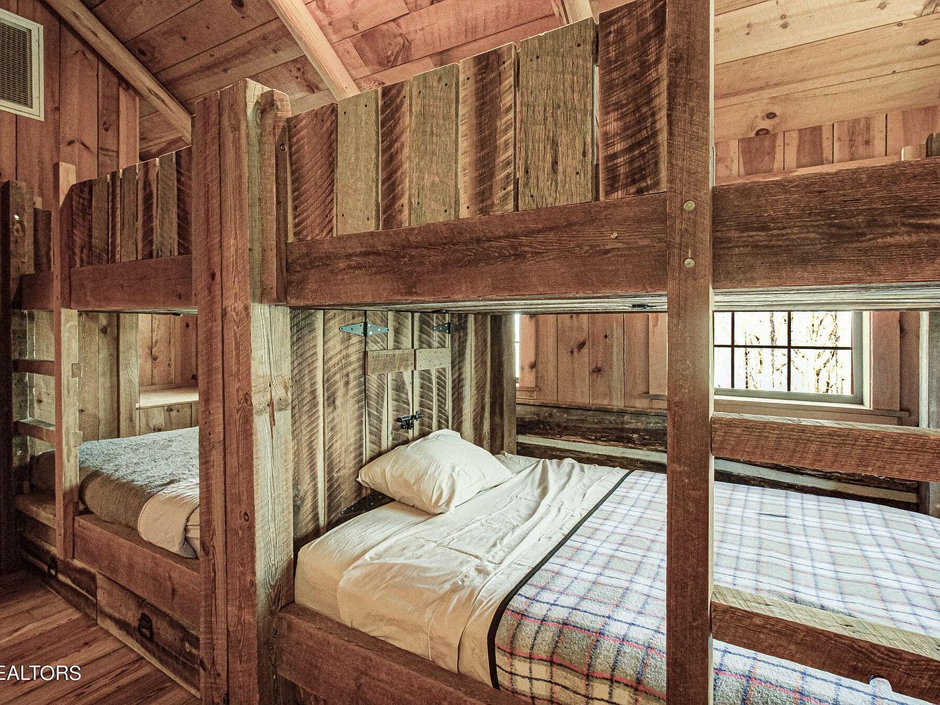 A cozy bunk room featuring rustic wooden bunk beds crafted from reclaimed timber, showcasing a weathered texture and natural finish. The walls are finished with warm-toned wood paneling, enhancing the room’s inviting atmosphere. Each bunk is adorned with simple bedding; one has a gray throw and the other, white linens with a plaid blanket. Natural light spills in through a traditional window, illuminating the space and highlighting its warm color palette. The layout promotes a sense of communal living, ideal for family gatherings or retreats, while the sturdy wooden construction emphasizes a rustic charm and durability.