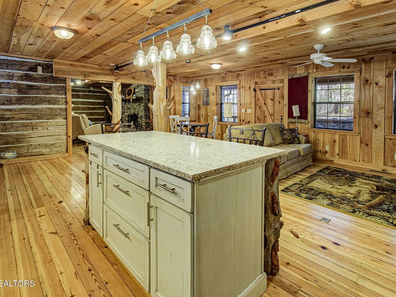 A rustic kitchen features a large island with a speckled granite countertop, complemented by natural wood cabinetry. The flooring, made of wide wooden planks, enhances the warm, inviting atmosphere. Exposed beams run across the ceiling, adding character, while pendant lights hang above the island, providing illumination. To one side, a cozy seating area includes a neutral-toned sofa, merged with the wooden accents of the walls. The log cabin aesthetic is further highlighted by the rough-hewn wooden walls and stone fireplace in the background, which creates a charming, homey vibe perfect for gathering and entertaining.