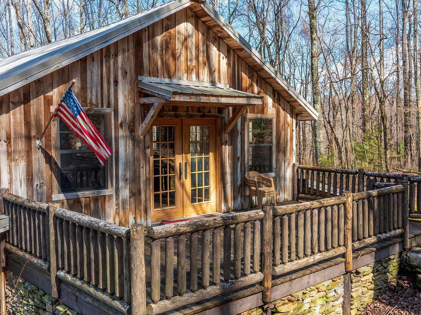 A rustic wooden house stands among tall trees, showcasing traditional American architecture. The exterior features weathered wood and stone accents that blend harmoniously with the surrounding nature. A spacious wrap-around porch, supported by sturdy posts, invites relaxation, while the gently sloping roof enhances the cottage feel. Large, multi-paned windows provide ample natural light and a view of the landscape. The stone foundation adds stability and character. An American flag flutters beside the porch, adding patriotic charm. The well-maintained grassy area contrasts with the earthy tones of the house, creating an inviting outdoor space.