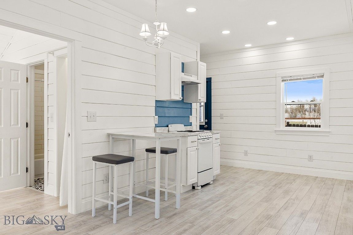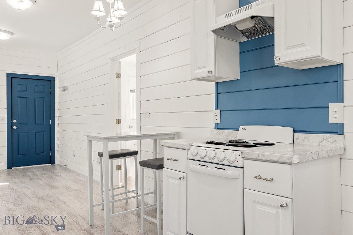 A compact kitchen space featuring pristine white shiplap walls and a light wood floor that enhances the airy, bright atmosphere. A deep blue accent door and matching blue backsplash behind the stove provide a bold pop of color. The kitchen layout includes white cabinetry with simple paneling, a marble-look countertop, and a small white stove. A slender white table with two dark, cushioned stools offers a cozy dining or work nook. Overhead, a classic white chandelier and recessed lighting ensure the space remains well-lit. The overall aesthetic combines farmhouse charm with clean, modern finishes.