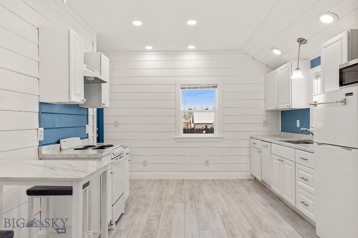This kitchen has a fresh, bright atmosphere thanks to the all-white shiplap walls and ceiling, complemented by crisp recessed lighting. The cabinetry is classic white with brushed metal hardware, paired with light gray marble countertops for a clean look. A pop of color comes from the blue accent wall sections behind the stove and sink areas. Stainless steel appliances and a pendant light above the sink add a modern touch. The flooring is a light, natural-toned wood that creates a warm but airy foundation. A window above the sink looks out into the backyard, bringing in natural light.