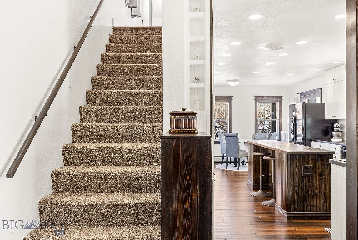 A wide carpeted staircase leads upward along a white wall with a sleek, dark handrail. At the stairway’s base, a wooden newel post and small decorative box add rustic charm. To the right, an open-concept kitchen and dining space unfolds with dark wood floors, a substantial island featuring matching dark cabinetry, and two modern barstools. Light walls and ceilings, along with recessed and flush lighting, create a bright, inviting atmosphere. Windows framed in dark trim let in soft daylight, while a round dining table with upholstered blue chairs anchors the far end of the space, blending farmhouse warmth with contemporary comfort.