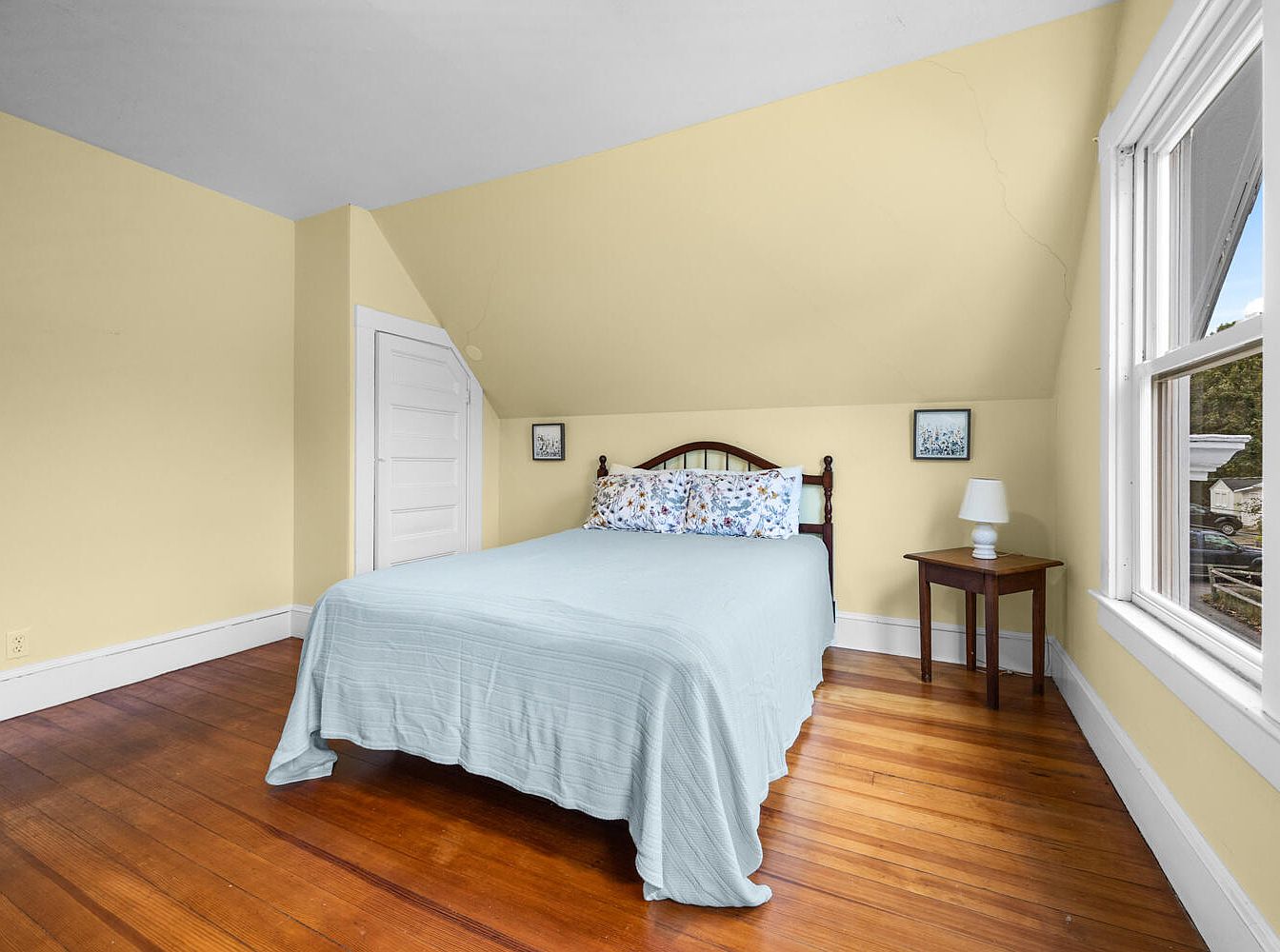 The space features a cozy attic bedroom with a gentle sloping ceiling painted in a soft yellow hue, enhancing warmth. Rich hardwood flooring contrasts beautifully with the light colors. A bed with a light blue quilt is centered, adorned with decorative floral pillows. Nearby, a small wooden side table holds a simple white lamp, providing illumination. Two framed artworks, likely depicting serene landscapes, hang on the walls, adding character. A white door leads to another area, and a series of large windows allow natural light, framing charming outdoor views, creating an inviting and tranquil atmosphere.