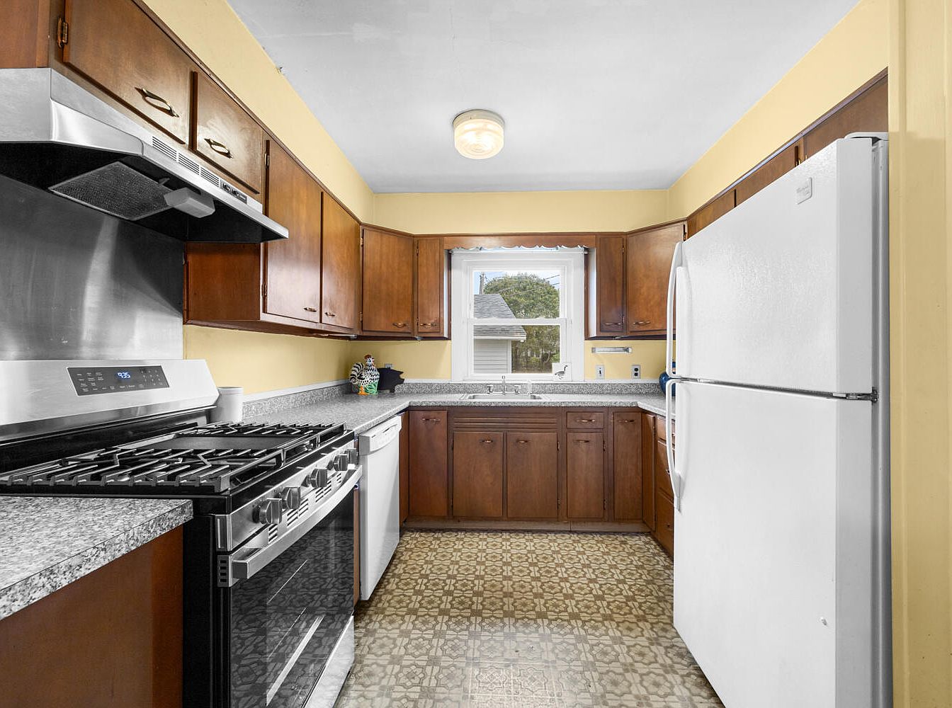 This kitchen features a compact design with a harmonious blend of modern and traditional elements. Warm wooden cabinetry contrasts beautifully with the light gray granite countertops. A stainless steel stove and hood are complemented by a white fridge, adding a contemporary touch. The bright yellow walls enhance the inviting atmosphere, while a large window allows natural light to illuminate the space. Decorative details include a patterned floor that adds texture and character. This kitchen layout promotes functionality with ample storage and workspace, making it an ideal setting for culinary endeavors.