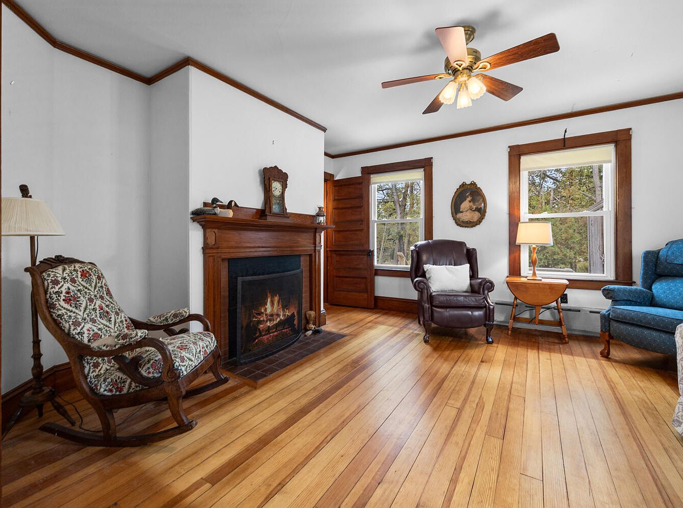 The living room features a warm ambiance with polished wooden floors and white walls adorned by rich, dark wood trims. A striking wooden fireplace acts as the focal point, complemented by a rocking chair featuring floral upholstery. Comfortably situated opposite is a plush brown leather armchair, accented by a white cushion, and beside it lies a stylish, oval side table with a lamp. Windows frame the room, allowing natural light to pour in and offering views of the surrounding greenery. A vintage portrait hangs on the wall, adding a classic touch to the serene atmosphere.