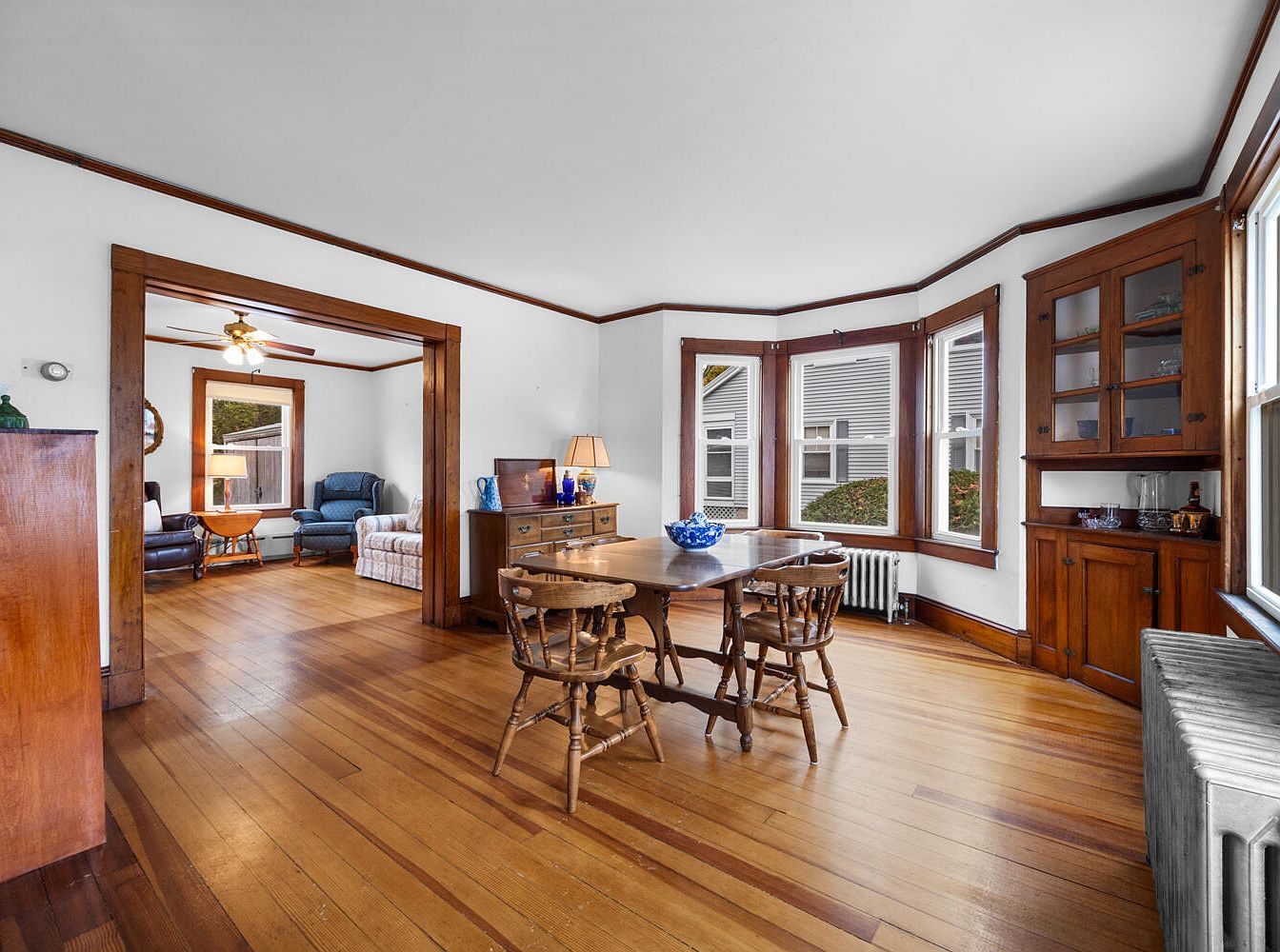 This dining area features warm, polished wooden floors that enhance the rustic charm of the space. A rectangular wooden table sits centrally, surrounded by four spindle-back chairs, inviting meals shared with family and friends. Natural light streams through large bay windows, equipped with white blinds, creating an airy atmosphere. A wooden sideboard displays decorative objects like a blue glass bowl and a lamp, while the surrounding wood trim and built-in cabinetry reveal classic craftsmanship. The adjoining living area is partially visible through an arched opening, showing additional cozy seating options and maintaining an open flow.