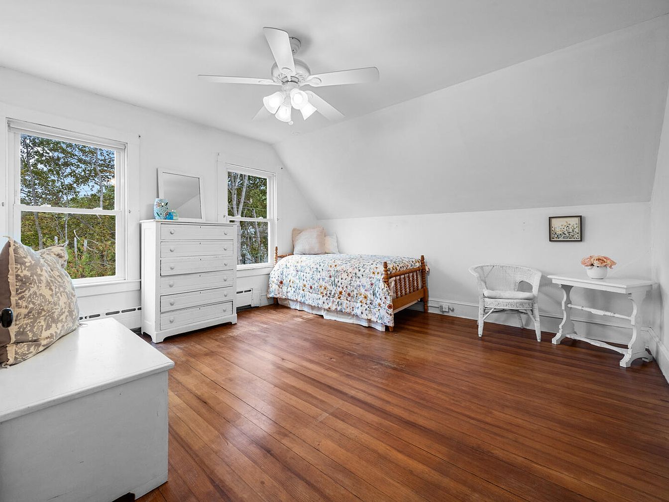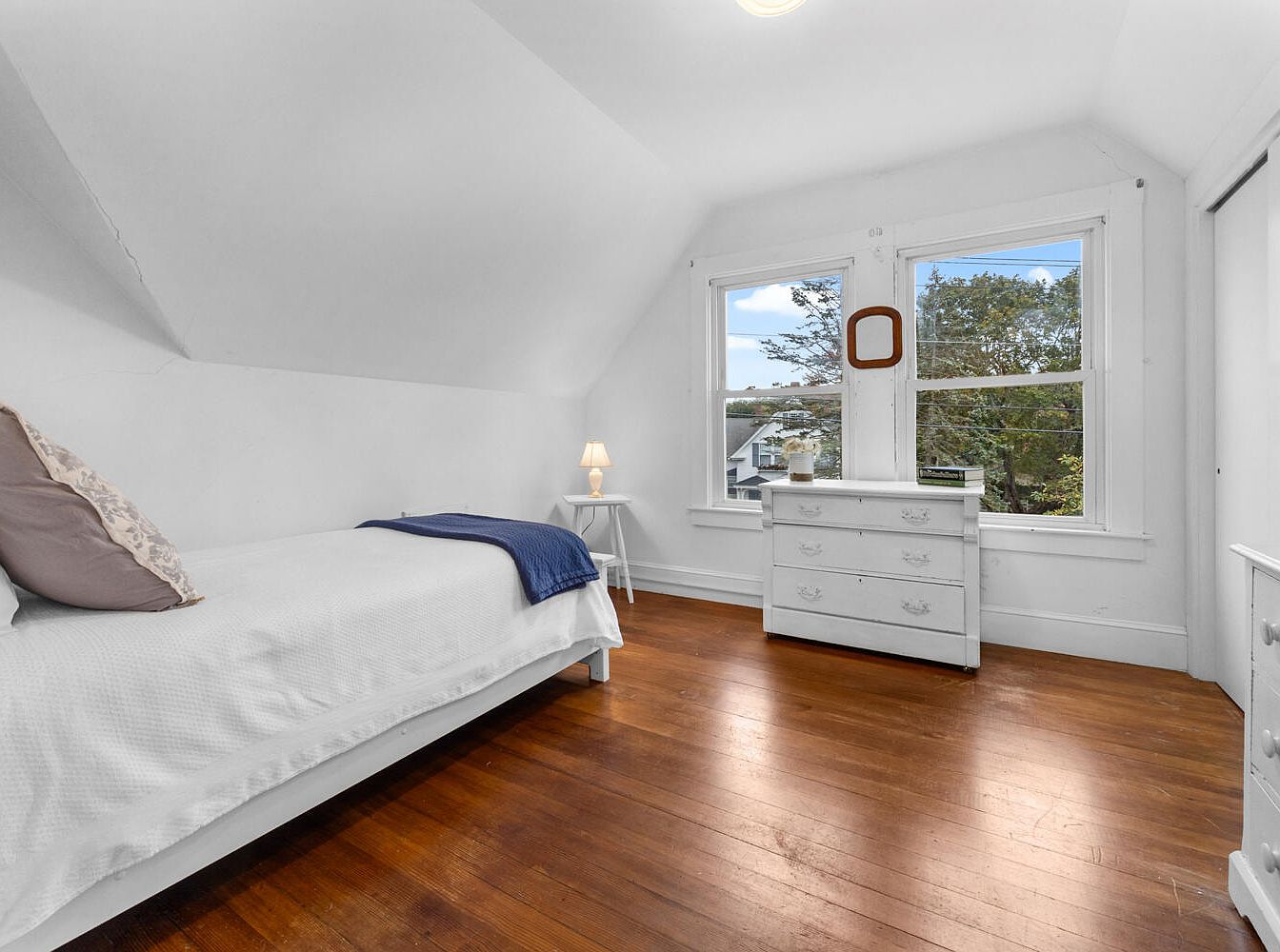 This cozy bedroom features a single bed adorned with white linens and a navy blue throw along the side. The walls are painted a bright white, enhancing the spacious feel, while the sloped ceiling adds a charming architectural element. Two large windows invite natural light, framed with simple white trim, offering serene views of the outdoors. A small nightstand with a soft lamp complements the minimalist décor. Across from the bed stands a white dresser with rustic drawer pulls, harmonizing with the warm wooden floor which adds warmth and character to the space.