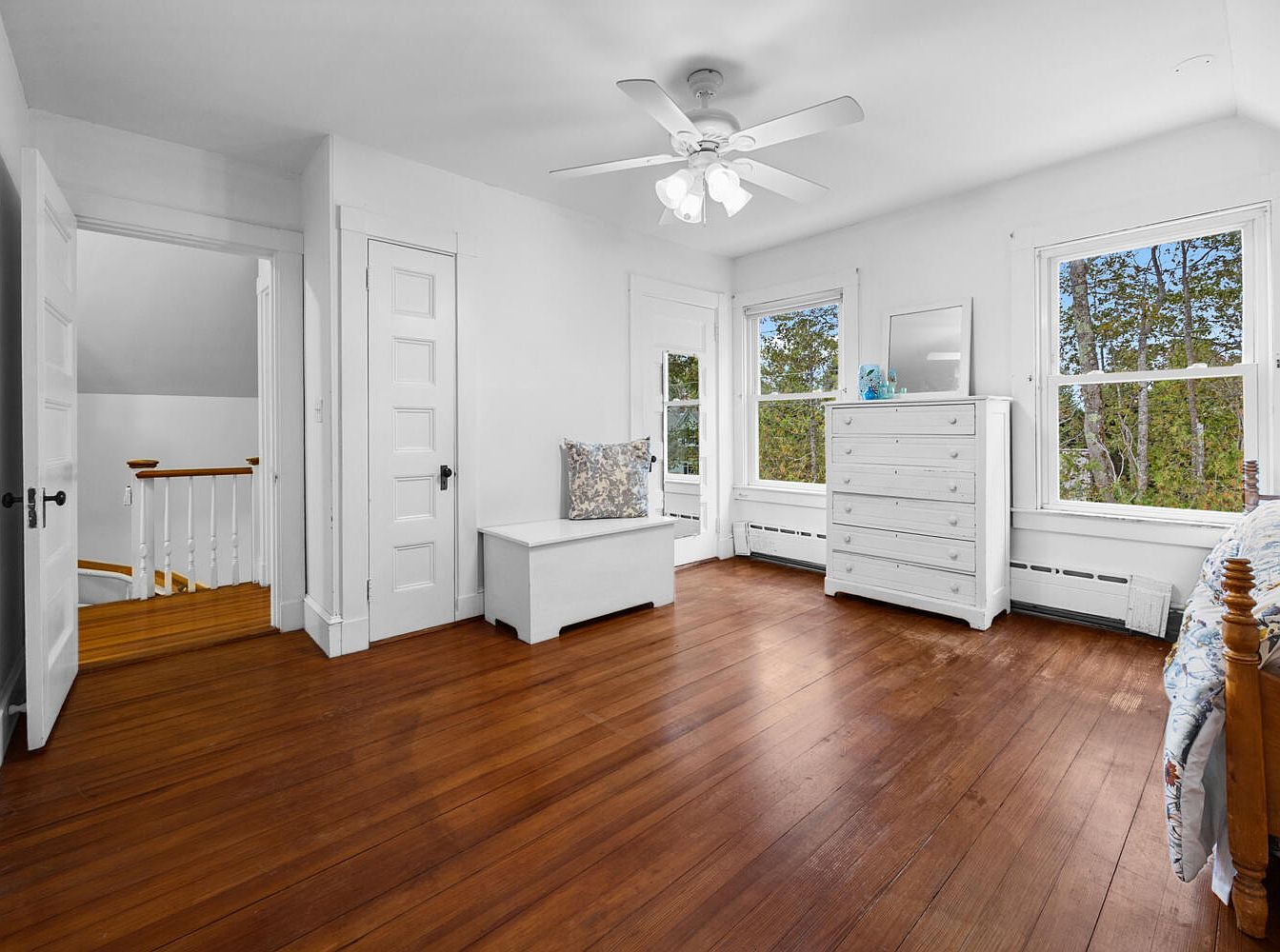 This bright and airy bedroom features a warm color scheme of white walls paired with rich, polished wooden flooring. The space is illuminated by natural light streaming through multiple windows, creating an inviting atmosphere. A classic ceiling fan adds a practical and stylish touch. The room includes a simple white dresser and a quaint seating area with a cushion, both enhancing the serene vibe. Architectural details include traditional panel doors, adding character. Opposite, a glimpse of a winding staircase suggests a home filled with charm. Overall, the design blends functionality with understated elegance.