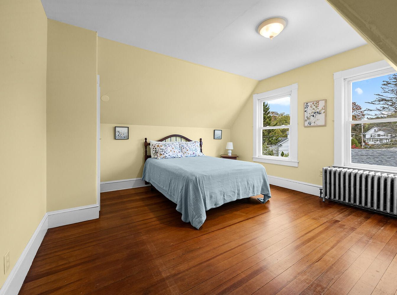 This cozy bedroom features a soft yellow color scheme that fosters warmth and comfort. The hardwood floors display a rich, deep hue, contrasting beautifully with the pale walls. A double bed, covered in a light blue bedspread, sits centrally positioned, flanked by small windows that invite natural light, highlighting the decorative pillows with floral accents. A bedside lamp rests on a wooden table, providing additional illumination. Completing the room is a vintage radiator against the wall, adding character. Subtle artwork enhances the space, balancing functionality with a welcoming aesthetic, ideal for relaxation.