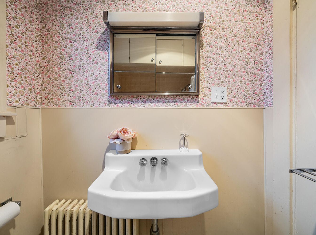 A compact bathroom featuring a vintage-style wall-mounted sink with a unique basin shape and chrome fixtures. Above the sink, a mirror is framed in metal, reflecting light. Surrounding the sink, a floral wallpaper in soft pinks and greens adds a touch of charm, enhancing the room’s warmth. Below, a white radiator complements the sink design, while a delicate vase with pink roses adds a decorative touch. The lower wall is painted in a muted cream, creating a gentle contrast to the lively wallpaper. Overall, the space combines functionality with nostalgic aesthetic appeal.