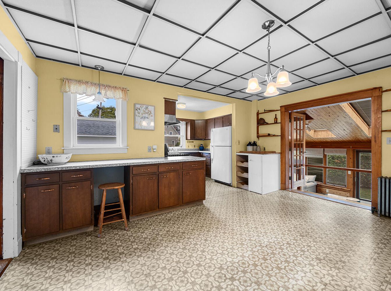 The kitchen features a warm yellow color scheme, creating a bright and inviting atmosphere. Dark wood cabinets provide a striking contrast to the countertops, which mirror the ornate tile flooring. A central light fixture with glass shades illuminates the space, while a large window offers natural light and views of the outdoors. An adjacent open doorway leads to another area, enhancing the open layout. Shelving on the right displays functional elements, maintaining a clean aesthetic. The space is designed for functionality and comfort, with a mix of vintage and modern touches that create a cozy, homey environment.