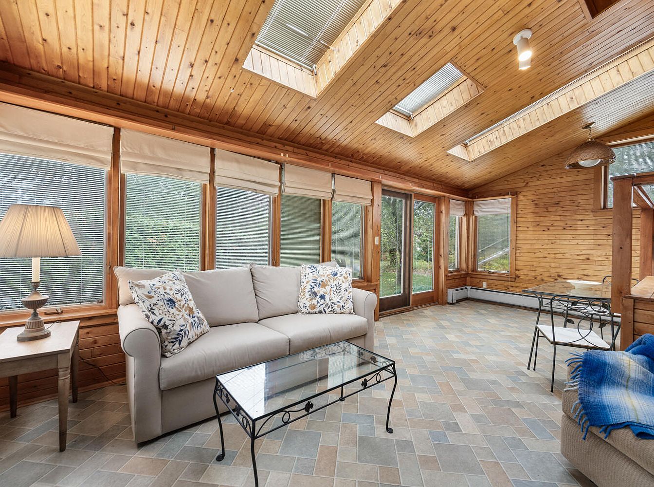 This sunroom features a warm, inviting atmosphere with a wooden ceiling and natural light flooding in through large windows and skylights. The walls are adorned with light wood paneling, enhancing the cozy feel. A soft, light-colored sofa sits comfortably with patterned throw pillows, paired with a glass coffee table that adds elegance. Adjacent to it is a small wooden side table with a soft-glow lamp, creating a relaxed ambiance. The flooring is a stylish mosaic of earth tones, harmonizing beautifully with the blue throw blanket draped on the sofa. This space is perfect for enjoying serene views.