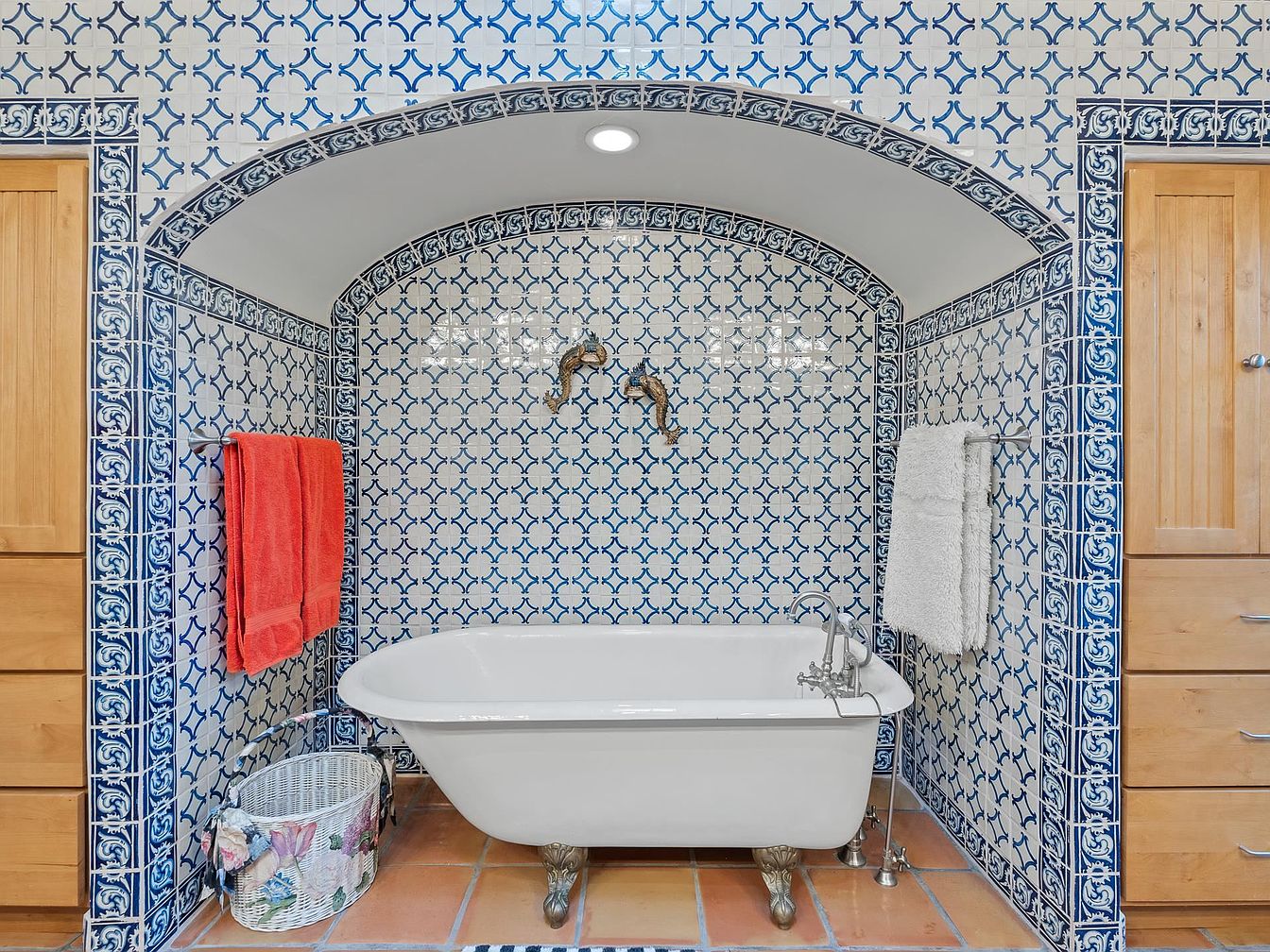 Featuring a striking blend of blue and white tiles, the bathroom exudes elegance through its intricate patterns. An arched alcove frames a vintage-style clawfoot tub, providing both a focal point and a sense of coziness. Natural wood cabinetry complements the tiles, offering warmth against the cool colors. A vivid orange towel adds a pop of color, while a white basket beneath the sink adds functionality. Architectural elements include a recessed ceiling with soft illumination, enhancing the space’s inviting atmosphere. The rich tilework and thoughtful layout create a serene, stylish sanctuary ideal for relaxation.
