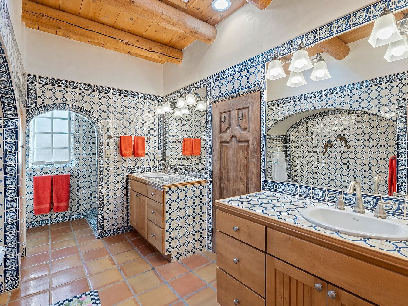 This bathroom showcases a vibrant tiled space with intricate blue and white patterns covering the walls, enhancing its artistic appeal. The terracotta floor tiles add warmth, contrasting beautifully with the cool hues of the tiles. A classic wooden vanity features a ceramic sink, complemented by brushed nickel fixtures that offer a modern touch. Above the vanity, a stylish mirror reflects light from pendant fixtures, illuminating the room. Archways lead to additional areas, distilling a sense of openness. Bright orange towels provide a striking pop of color, while exposed wooden beams on the ceiling introduce a rustic charm.