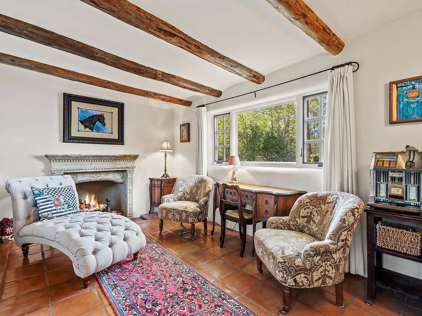 This inviting living room showcases a blend of comfort and elegance. Exposed wooden beams create a warm overhead ambiance, while the terracotta tiled floor adds rustic charm. A plush chaise lounge with button-tufting provides a focal point, complemented by a patterned throw pillow. A traditional area rug in rich colors harmonizes the space. To the side, a vintage armchair upholstered in floral fabric offers additional seating. The elegant fireplace, framed by intricate stonework, creates a cozy atmosphere, especially with a gentle glow from the flames. Natural light streams through large windows, enhanced by soft, flowing curtains, accentuating the tranquil view.